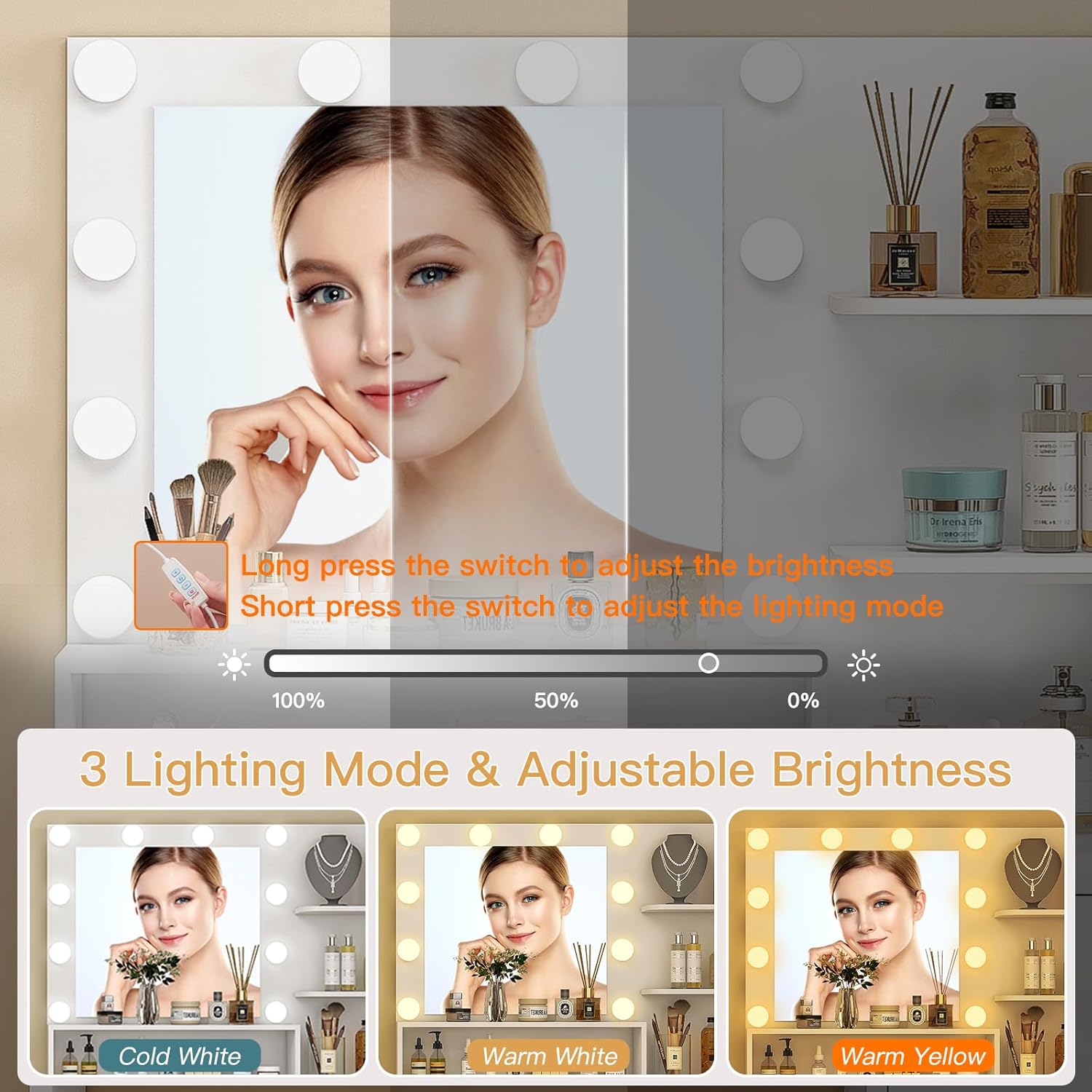 Quimoo Makeup Vanity Desk with Mirror & Lights, Vanity Desk with 5 Drawers & Storage Shelves, Vanity Table, 3 Color Modes & Adjustable Brightness Dressing Table, Bedroom, White