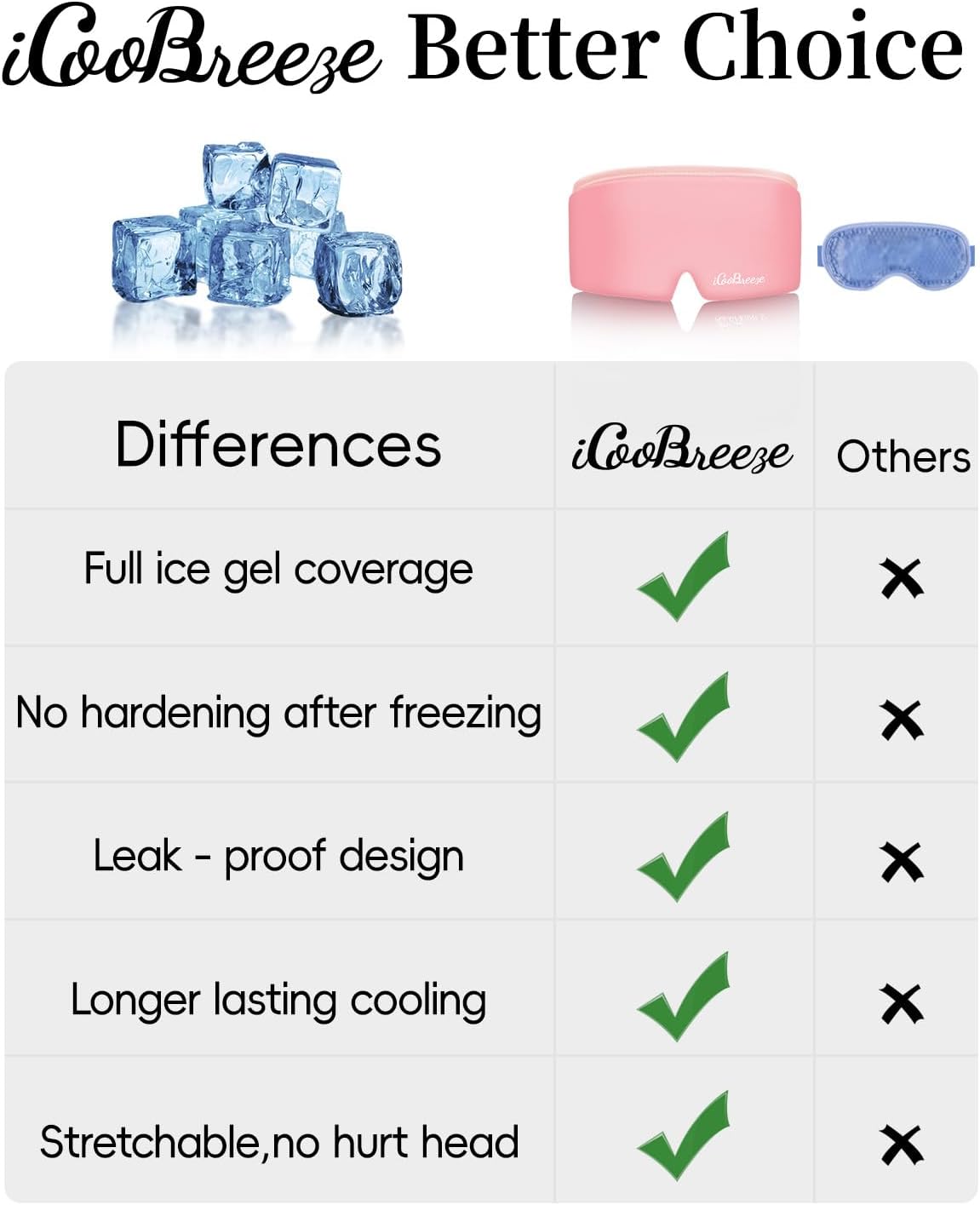 - ★WHY CHOOSE US? The iCooBreeze cooling eye mask is crafted with ultra-thick, non-toxic gel. The gel is evenly distributed, soft, and flexible—it never hardens or leaks, even after freezing. It stays cool for extended periods and is fully reusable.