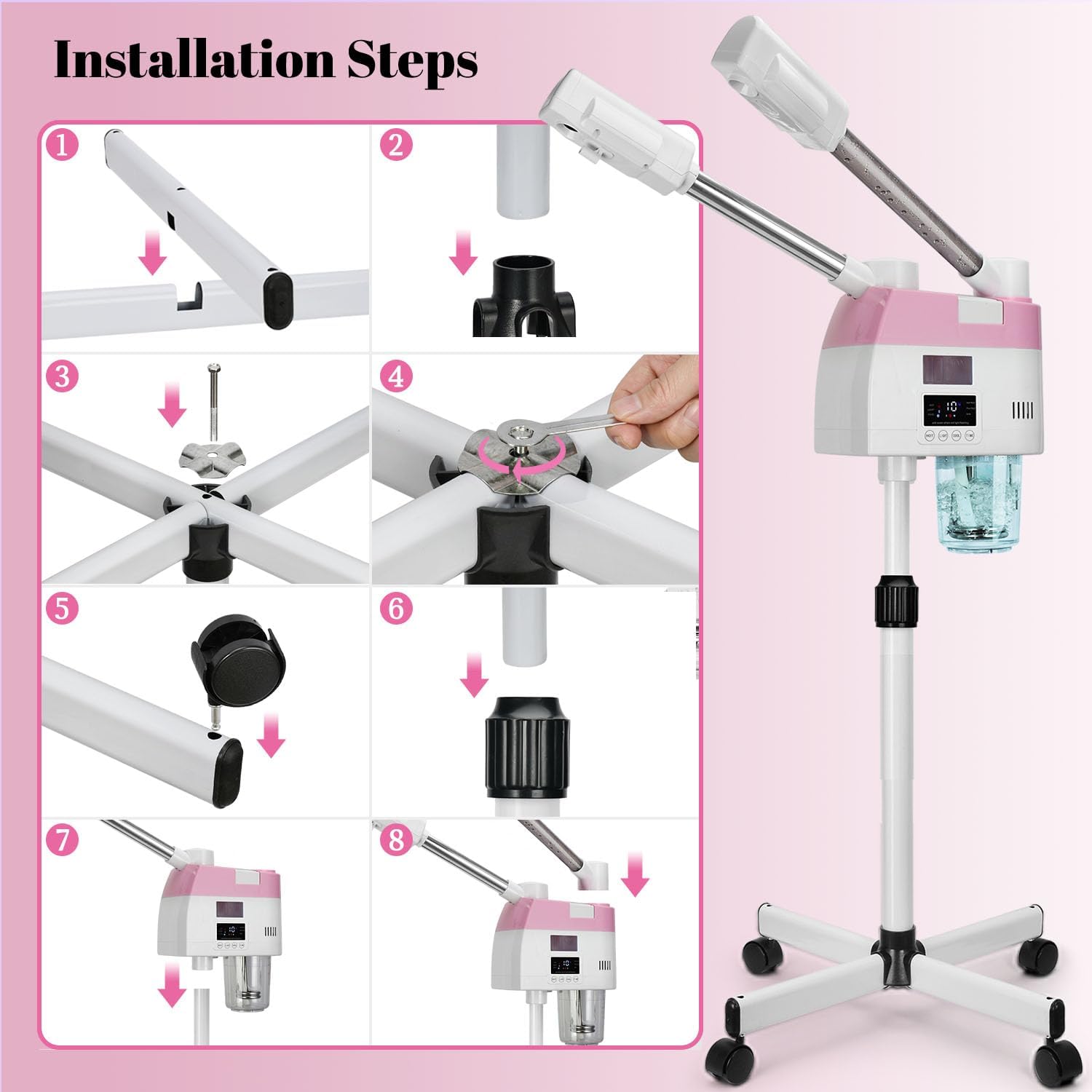 - 💗【360°Rotating for Convenient Use】Adjustable height retractable lift rod and universal rolling wheels meet your different needs.And the steam nozzle can rotate 360°, allowing for easy adjustment of height and positioning for the face, neck etc. Whether sitting or lying down, it is convenient to moisturize every part of the body.