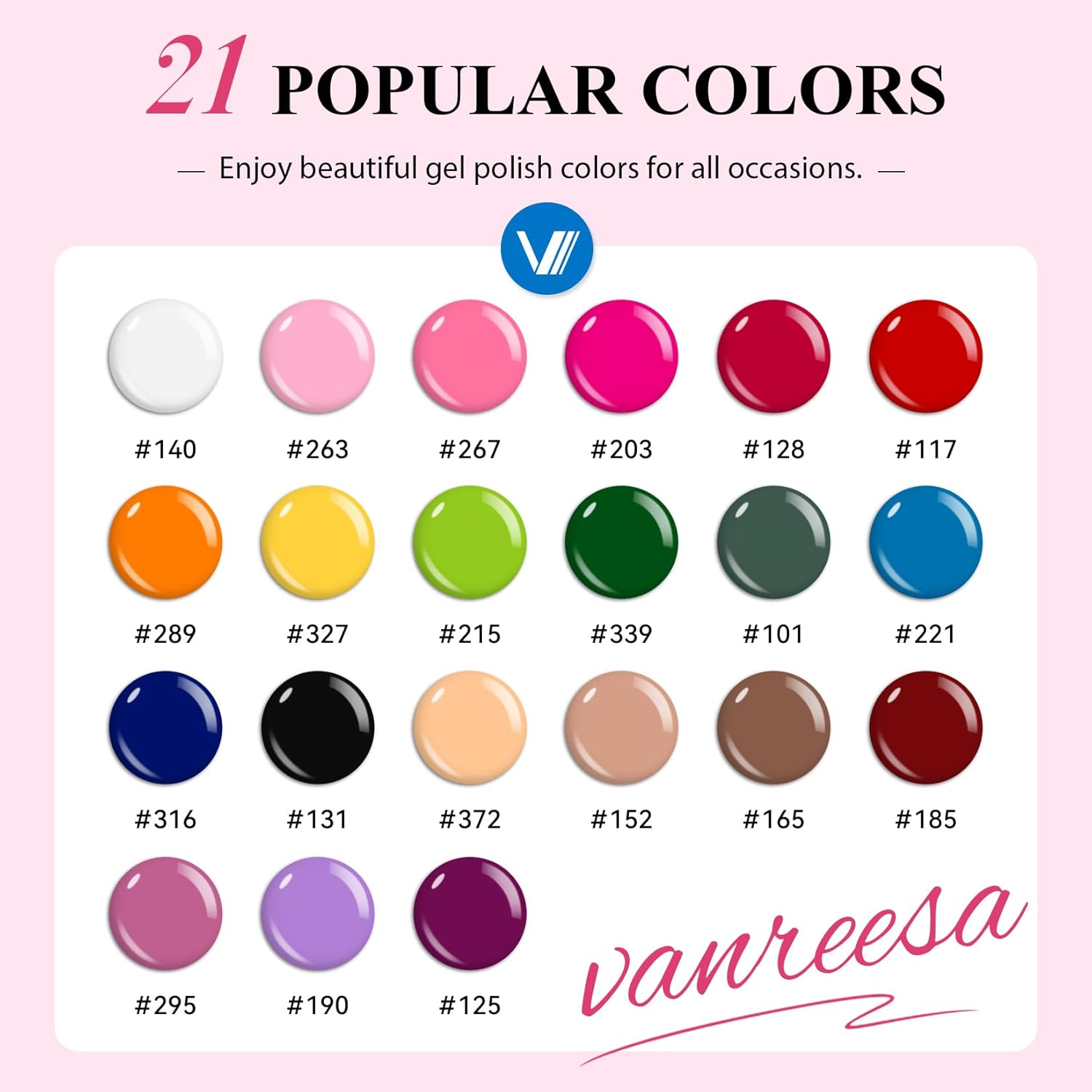 - ăWhat You Getă This gel nail polish set includes 7ml gel nail polish*21, 7ml base coat*1, 7ml glossy top coat*1 and 7ml matte top coat*1. VANREESA gel nail polish offers a rich and vibrant color palette, making it suitable for all occasions and holidays. Whether you're a beginner or an experienced nail art enthusiast, VANREESA gel polish will meet all your manicure needs.