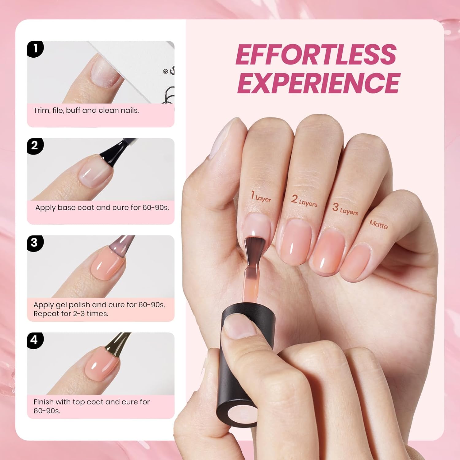 • 【Sheer Jelly Gel Styles】Apply several layers to build up the color from clear translucent to solid opaque. Each layer, whether one, two, or three layers, creates a different effect. The jelly gel and cat eye gel is UV gel and need to be cured 60-120s.