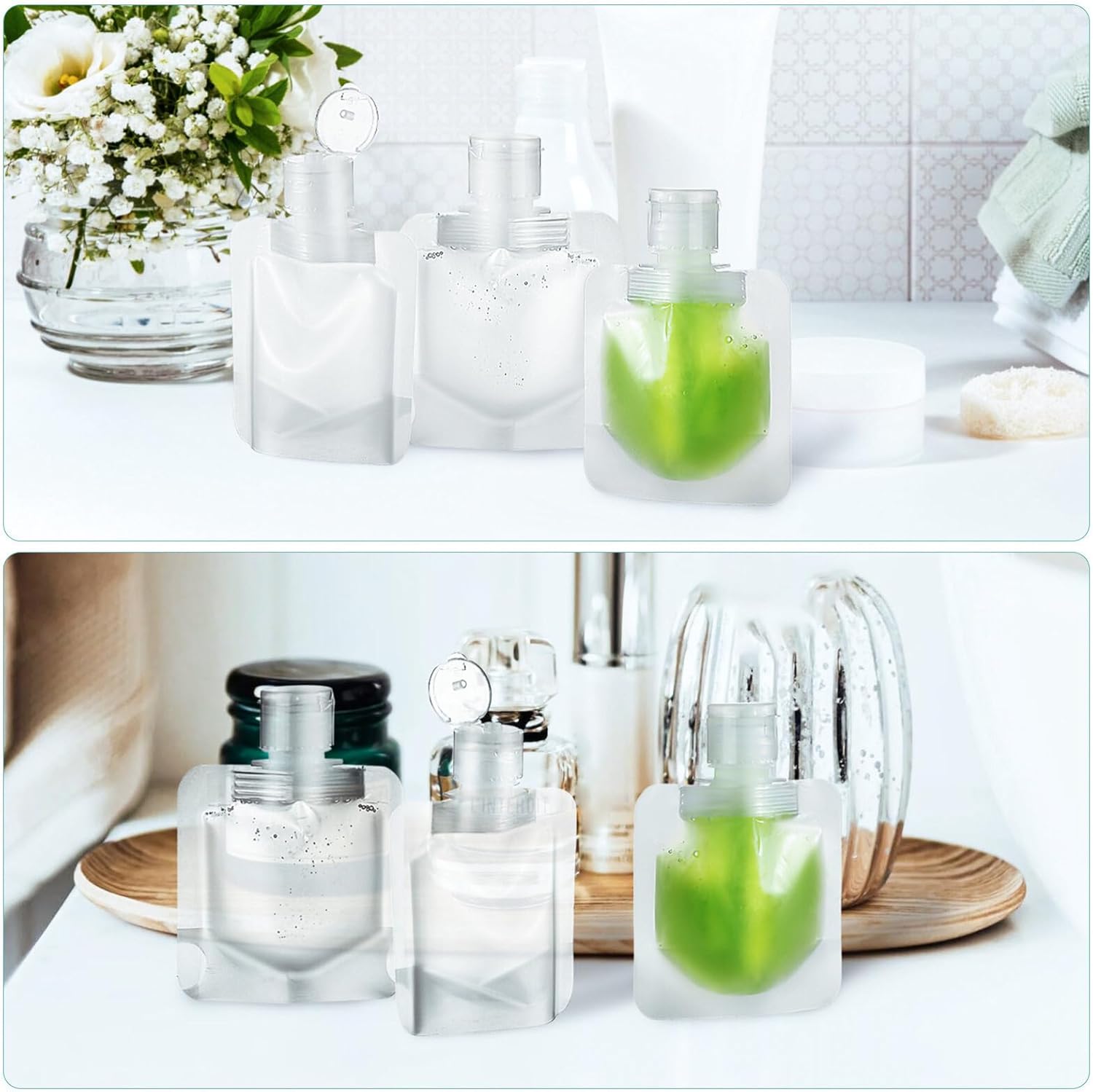 - Multi-Purpose: Our travel cosmetic containers pouches are suitable for kinds of lotions products. They can store gel, cream, lotion, shampoo, conditioner, essential oil, makeup water and so on