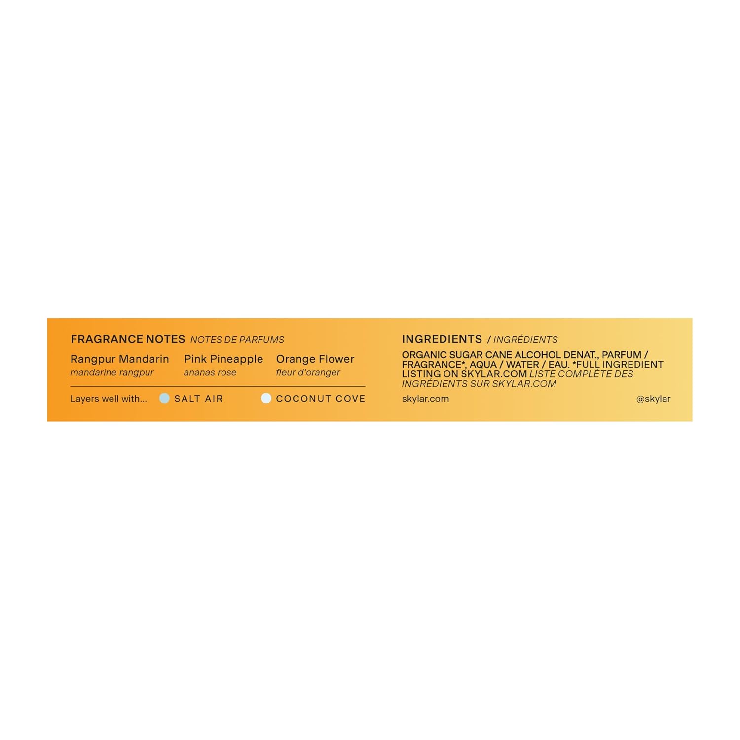 - Inviting Scents: Top-Rangpur mandarin, Blood orange, Pink pineapple. Middle- Rose water, Orange flower, Freesia. Base- Amber, Cedarwood, Musk.