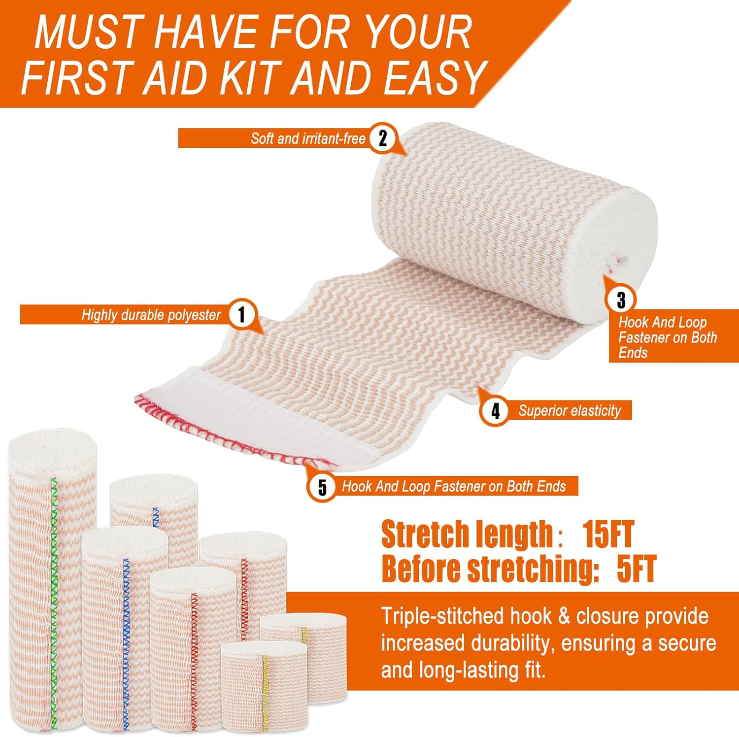 - Premium Quality Material: Our elastic bandage wrap is made from superior quality Highly elastic polyester cotton thread materials, Triple stitching ensuring durability and comfort even with continuous usage. Ideal for providing the support your body needs.Standard length is 5 ft. Stretched length is 15 ft.