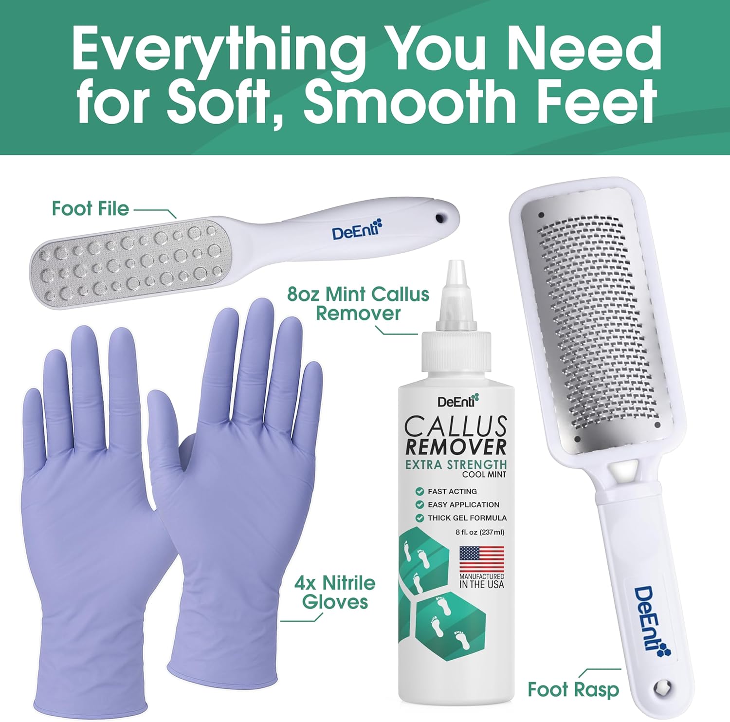 DeEnti Callus Maintenance Pack, Bundle Includes Mint Scented Callus Remover, Metal Foot Rasp, Foot File, and 4 Pairs of Gloves, Salon Grade Foot Care, Home Manicure and Pedicure Kit