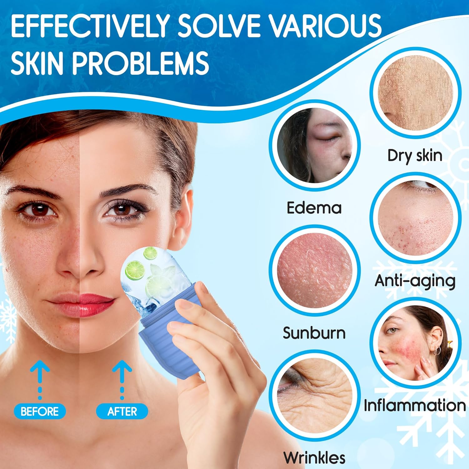 - Facial Ice Roller - Suitable for all skin types, this ice face roller reduces blood redness, removes puffiness, and shrinks pores while lubricating the skin. Use it also as a body massager which can effectively promote facial blood circulation.