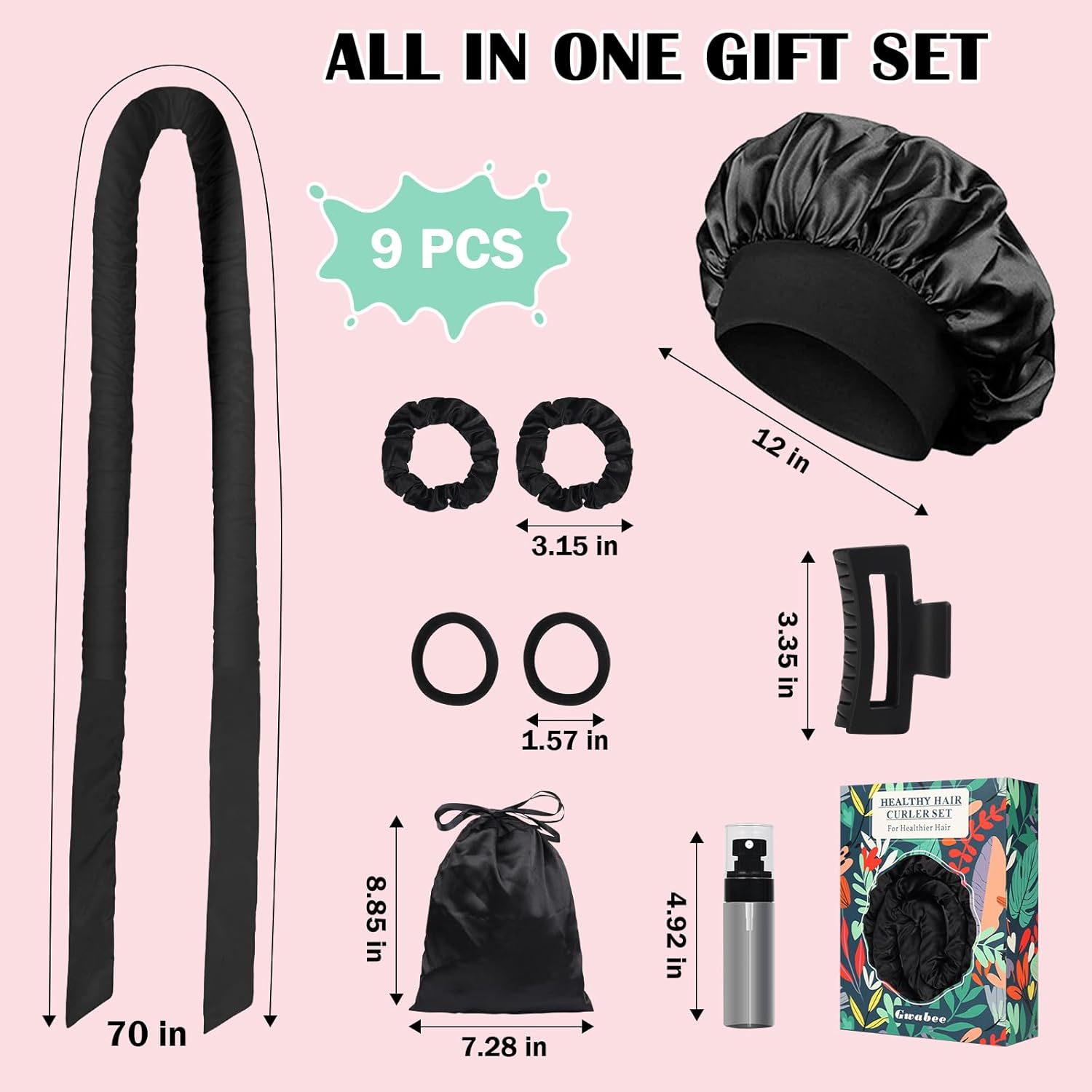 - Thoughtful Set for Women: Our heatless curling set includes 9 items: 1 x 70-inch long satin curling rod headband, 1 x satin hair bonnet for sleep, 1 x hair clip, 2 x satin hair ties, 2 x elastic hair ties, 1 x satin storage bag, and 1 x spray bottle. This all-in-one curling rods set is packaged in an exquisite box, making it the perfect present for your wife, mother, daughter, friends, or colleagues