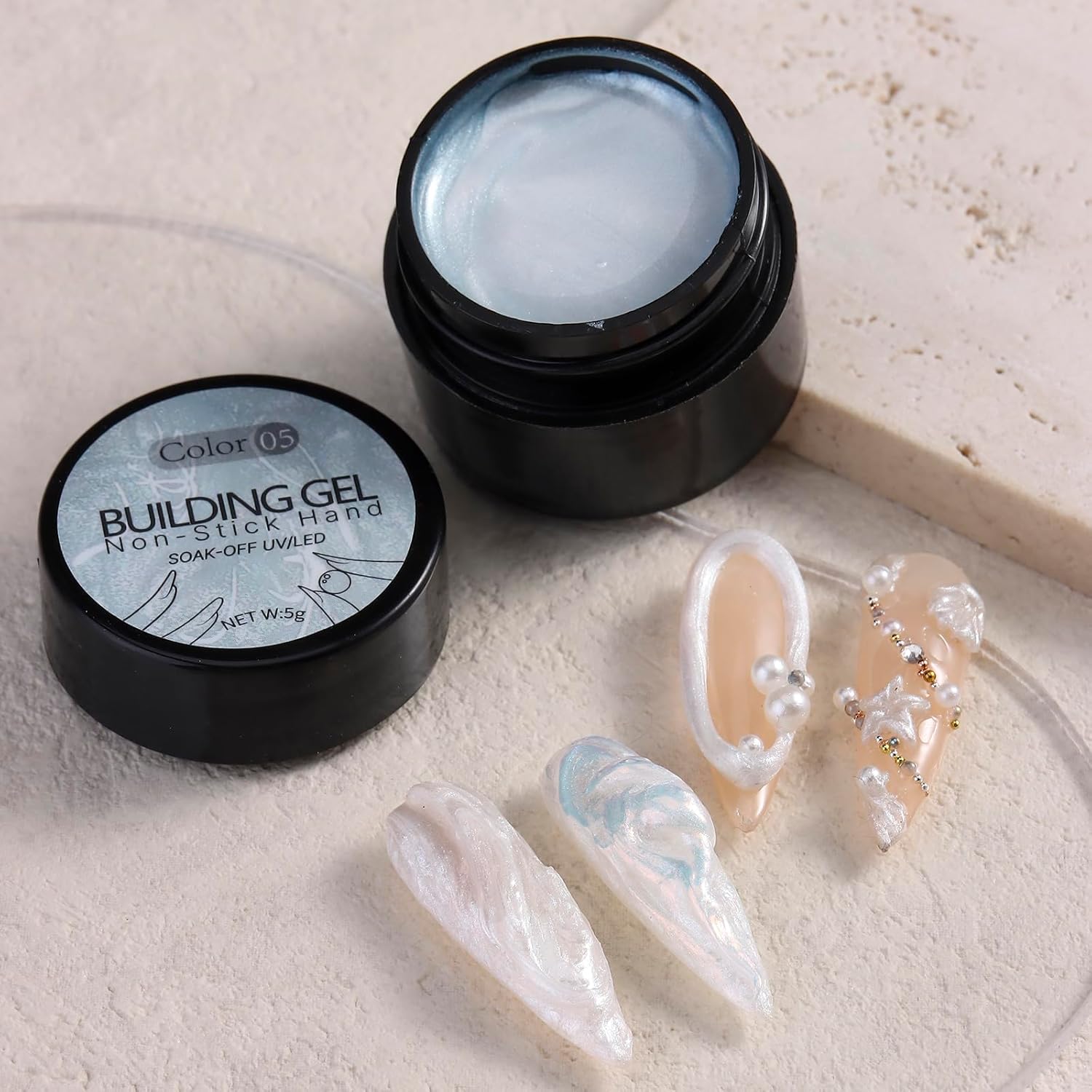 - 【You Will Get】 6 colors (5g for each color) iridescent aurora mermaid solid builder gel for nails, 2pcs dual tipped silicone nail art sculpture pen and 5pcs acrylic sticks.