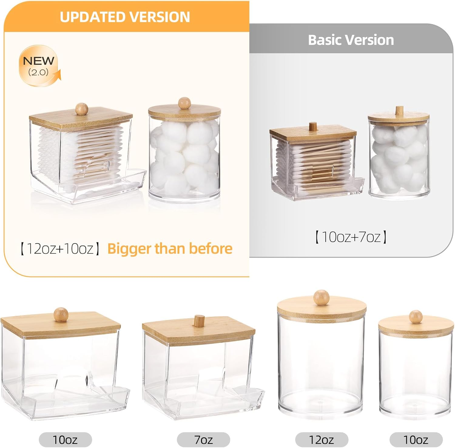 - Bigger than Before - Compared to the previous one, this one is bigger, 1pcs Qtip Dispenser - 10oz , 1pcs Cotton Ball Holder - 12oz. Putting&Picking cotton swabs more easier