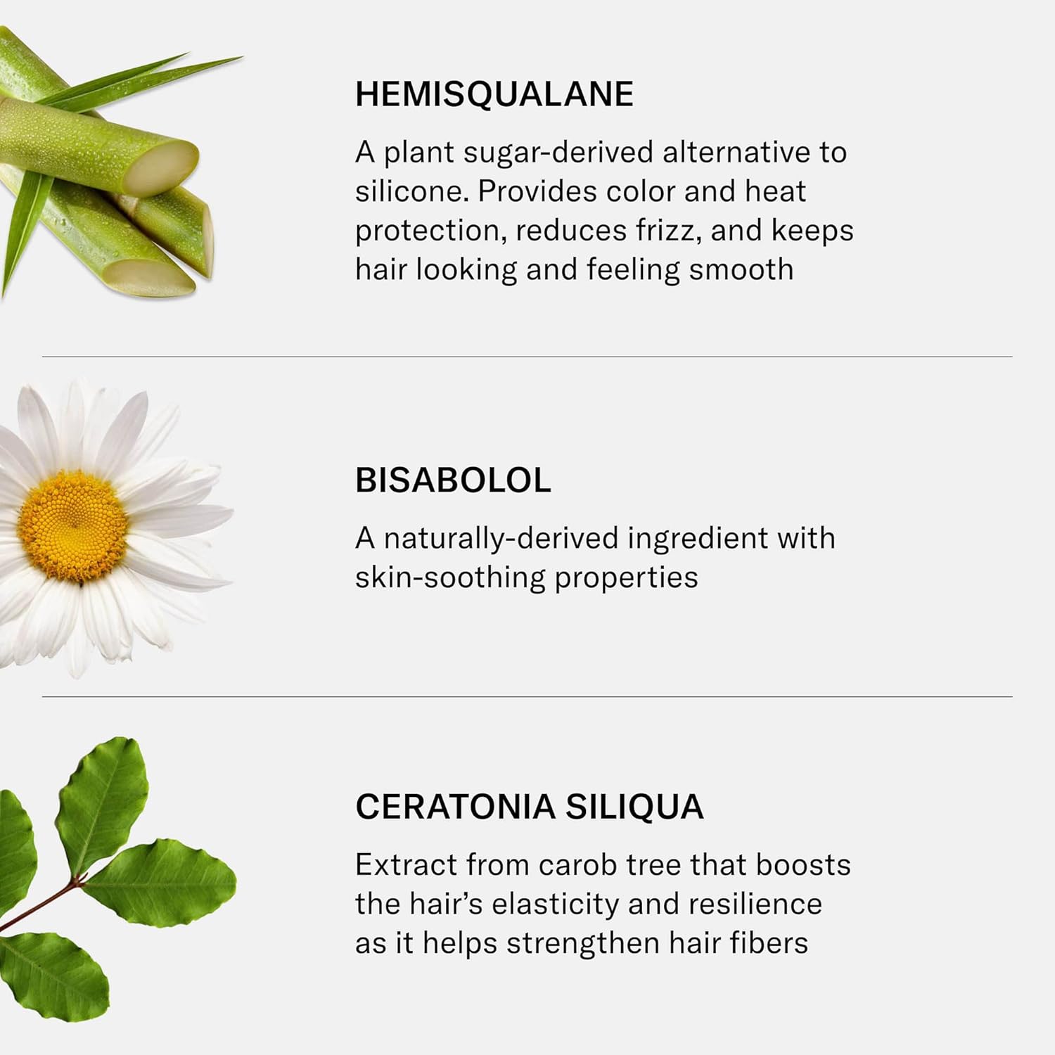 - Hero Ingredients: Hemisqualane β a plant sugar-derived silicone alternative that reduces frizz, provides color and heat protection, and keeps hair smooth. Bisabolol β a naturally-derived ingredient that soothes skin. Ceratonia Siliqua β carob tree extract that boosts elasticity and strengthens hair fibers. Moringa Oleifera β horseradish tree extract that helps protect hair from pollution and UV damage. Squalane β a plant sugar-derived moisturizer that nourishes, restores luster, and adds shine and softness.