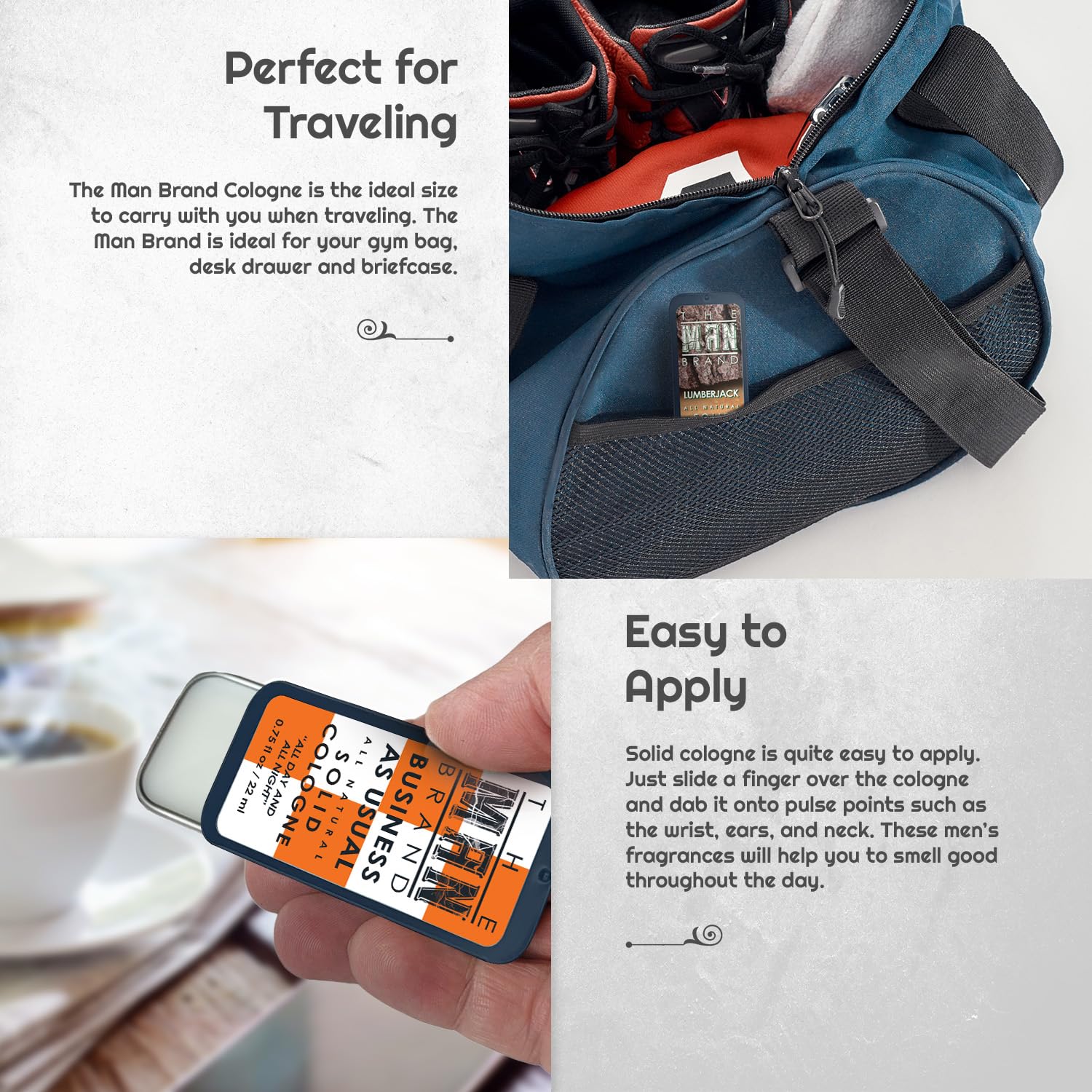 - The Traveler's Essential:Our solid colognes for men is the ultimate travel size mens cologne. Experience the scent touch-ups on the go, without worrying about bulky bottles.