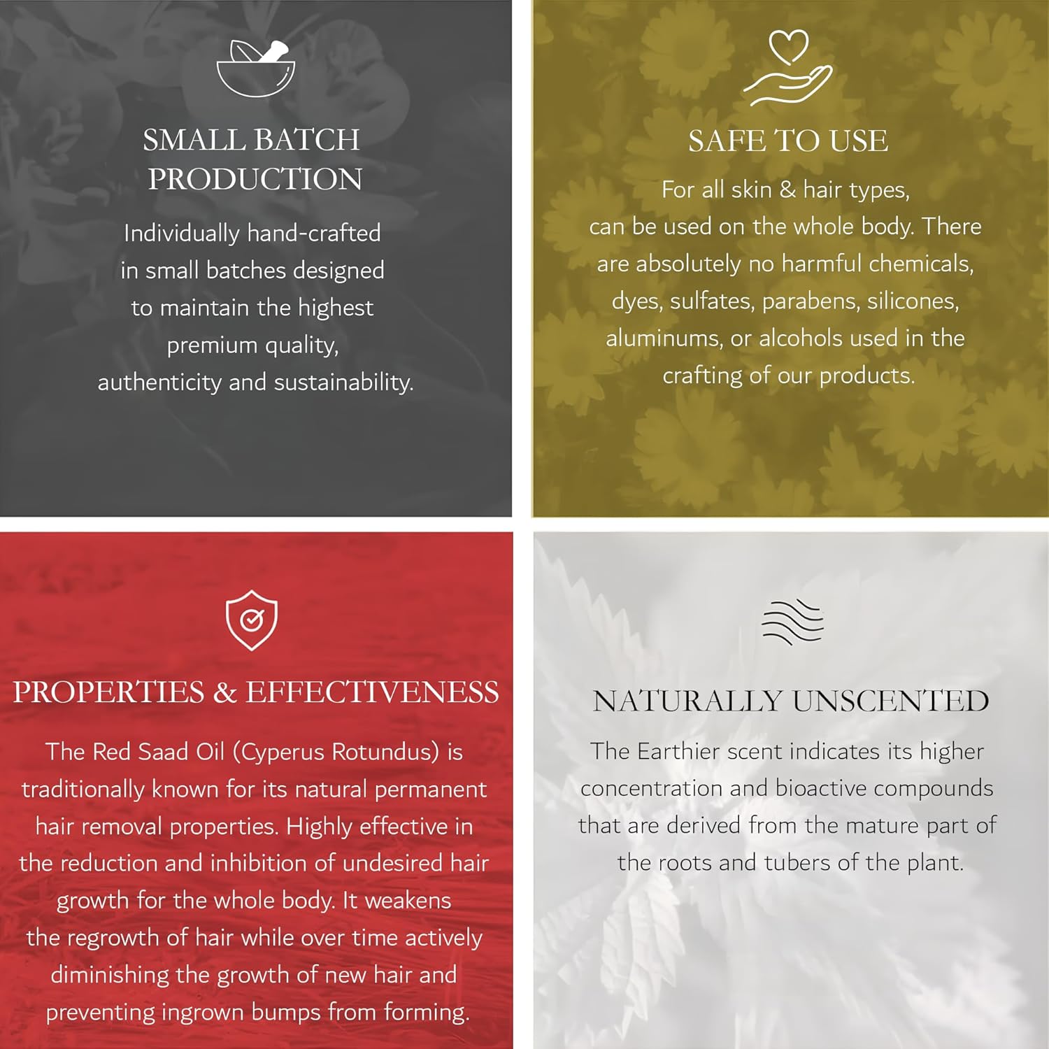 - PROPERTIES AND EFFECTIVENESS: The Red Saad Oil (Egyptian Cyperus Rotundus) is traditionally known for its natural hair removal properties. Highly effective in the reduction and inhibition of undesired hair growth for the whole body. Weakens the regrowth of hair while over time actively diminishing the growth of new hair and preventing ingrown bumps from forming. Noticeable effects within the 1st week when used as directed.