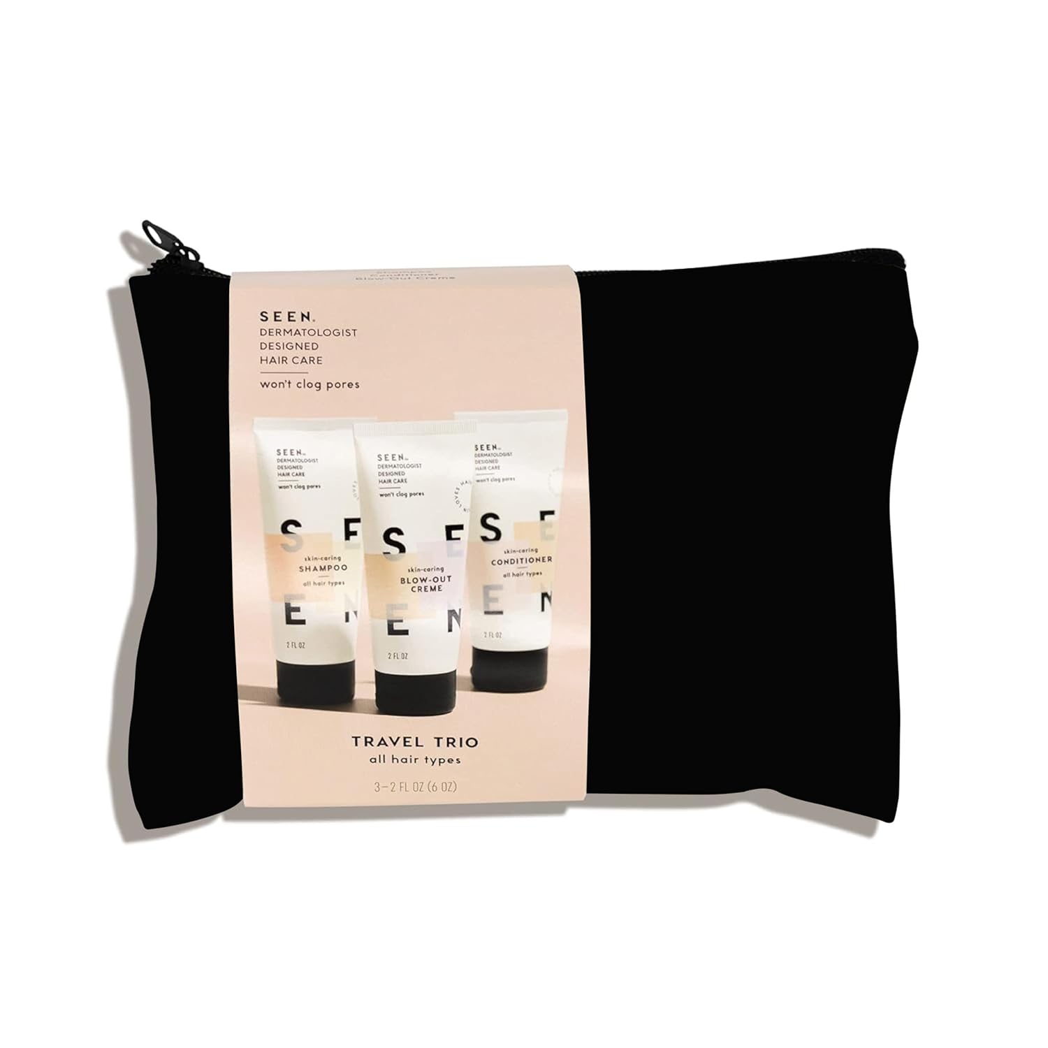 - TSA-approved mini-sizes of SEENโs fragrance-free Shampoo, Conditioner, and Blow-Out Creme for stronger, smoother, healthier hair