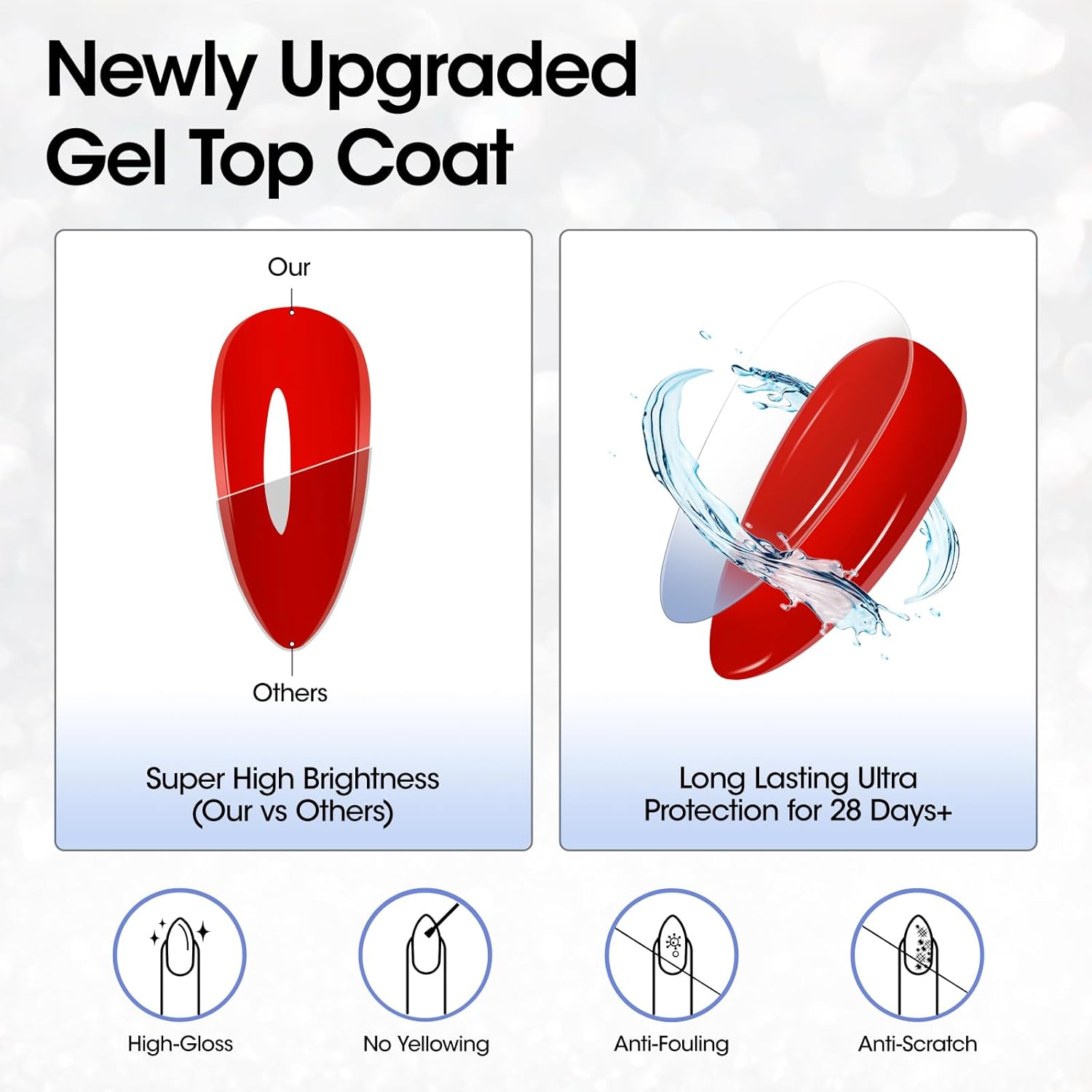 - Maximum Brightness & Protection: The newly upgraded formula offers excellent spreadability, a light and clear texture, and superior brightness compared to other top coats. With ultra-durable protection that lasts over 28 days under the correct application, your nails will remain vibrant and shiny, making this top coat the perfect solution for long-lasting, salon-quality manicures at home.
