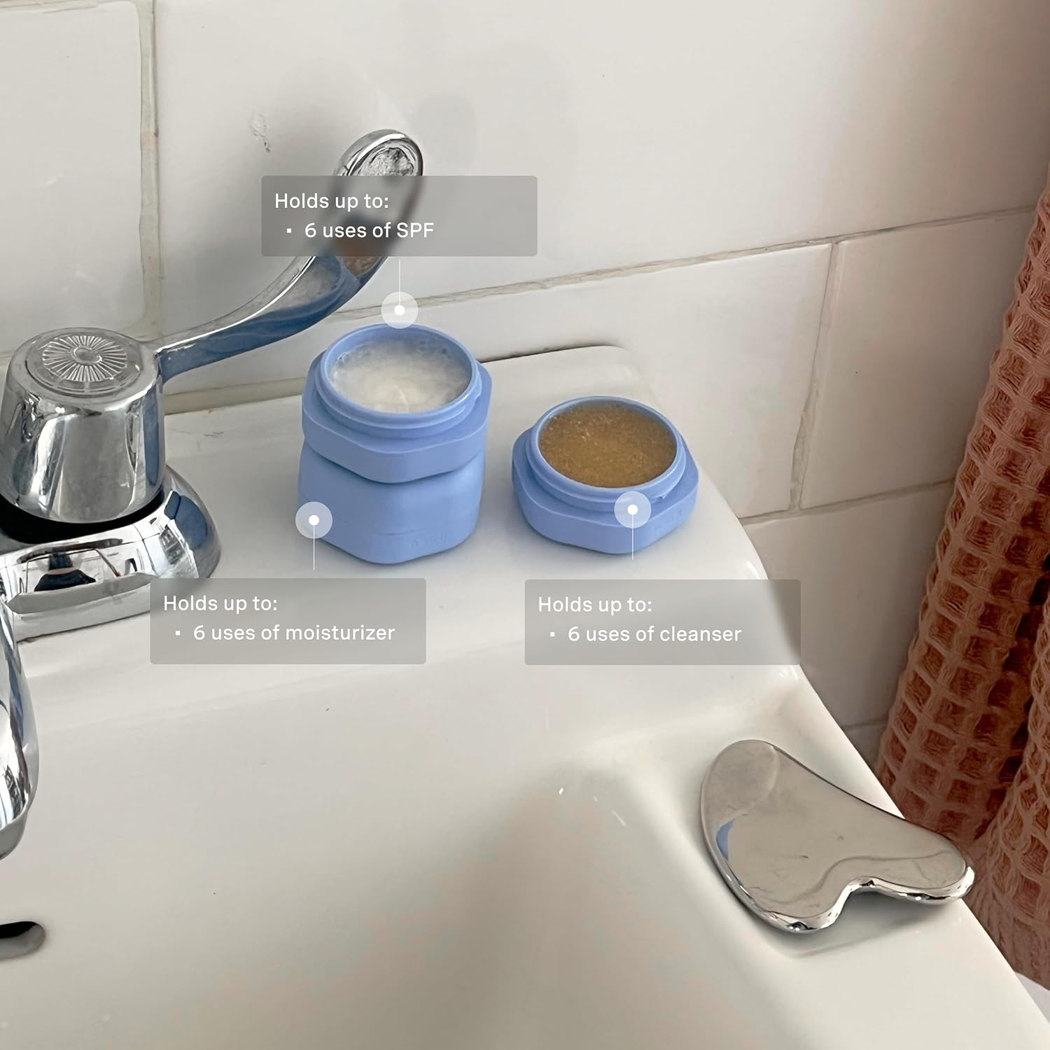 Cadence Travel Containers Basic Skincare Set - Magnetic Containers with Lids,Carry On Travel Essentials For Women/Men - 3 Small Capsules (0.56oz) - Cleanser, Moisturizer & Sun-Icon Labels - Pacific