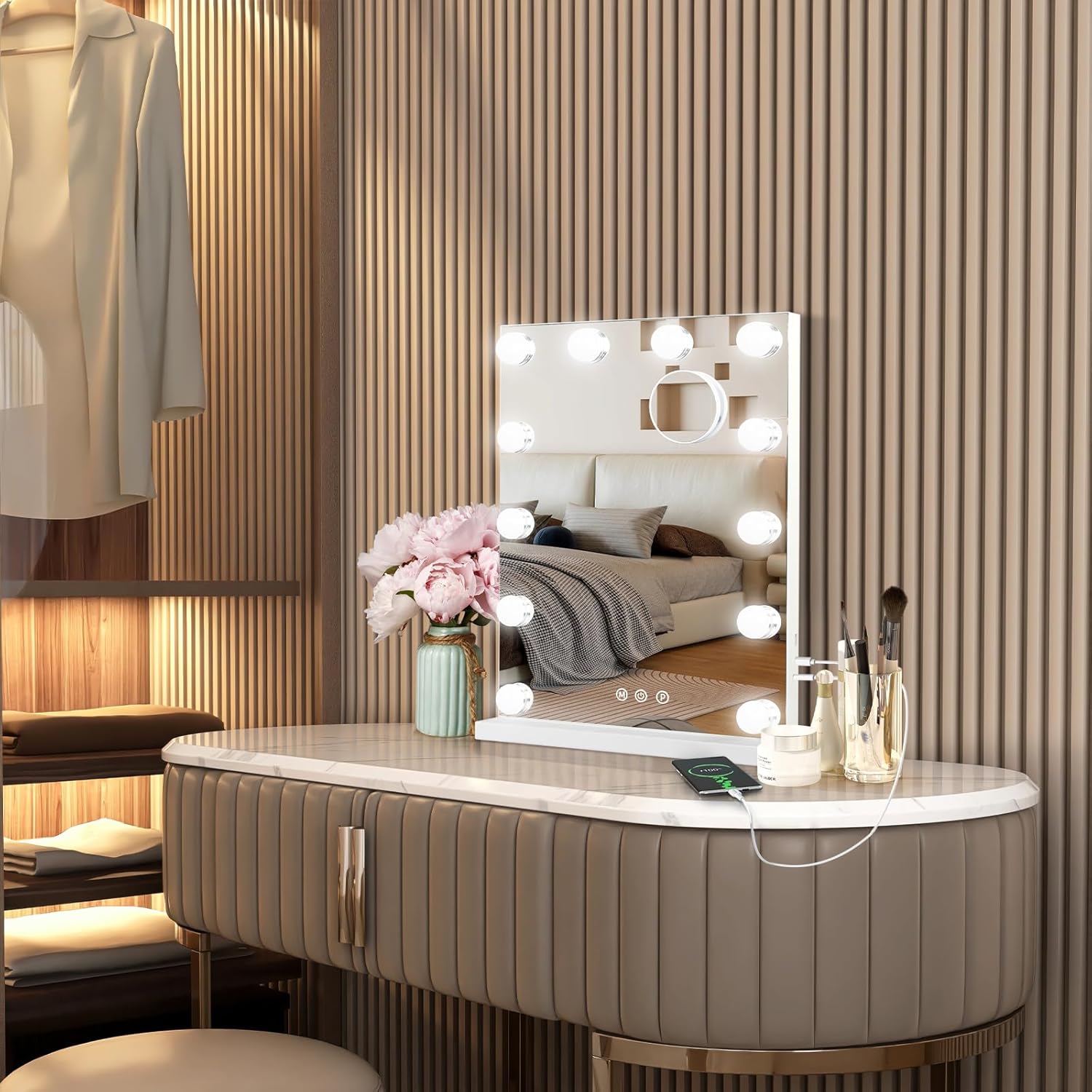 Hollywood Vanity Mirror with Lights, 12 Dimmable Bulbs, 3 Color Lights,Make Up Lighted Mirror, Aluminum Metal Frame, USB Charging Port(14" x 18")