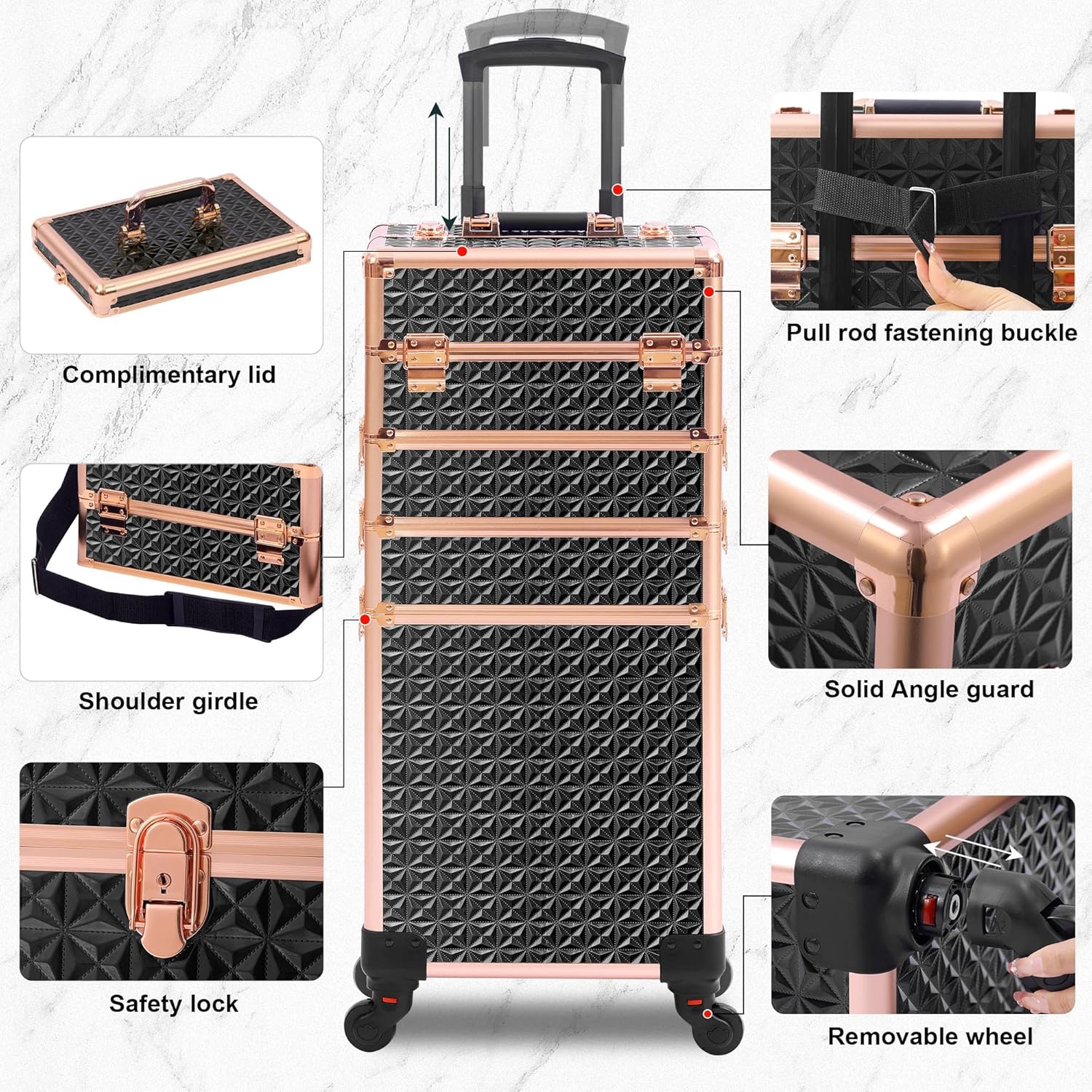 - 【Safety and Portability:】The makeup case organizer is secured with two locks on each layer, ensuring the safety of items with handles on the top. The telescopic handle is adjustable, meeting the needs of individuals of varying heights. The first layer of the case comes with a shoulder strap for separate use.