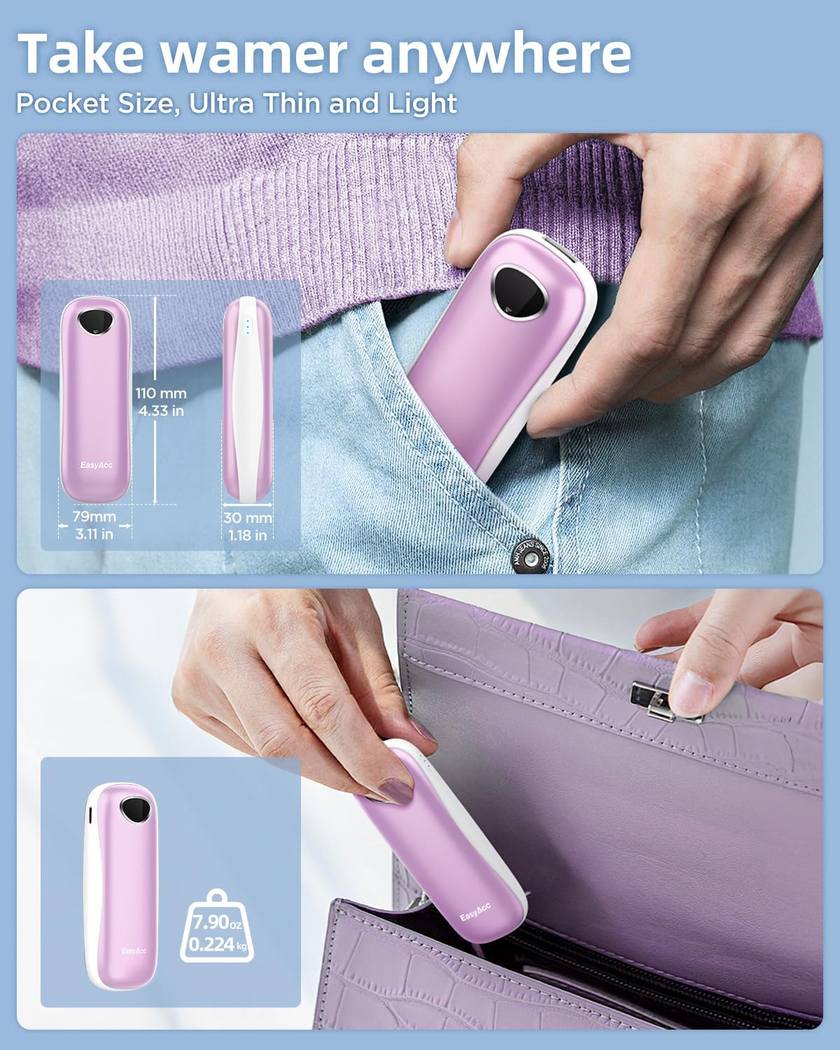 - 【The Palm-Friendly Design】: After 3 years of research, EasyAcc launched the most suitable hand warmers rechargeable for palm grip, perfect fit in the palm of your hand, Ergonomic design is comfortable to hold. The perfect winter companion for you and your Lovers!
