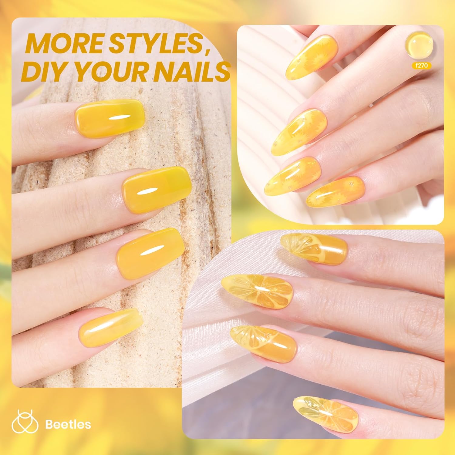- 【Fashion Summer Jelly style】The New Beetles 15ML Summer Gel Clear Yellow Jelly Gel Nail Polish is Coming! . Elegant shades of popular and trendy colors suitable for all seasons and daily routine life! The sheer yellow jelly gel makes you seem to be shining in the warm sun, showing your energetic personality!