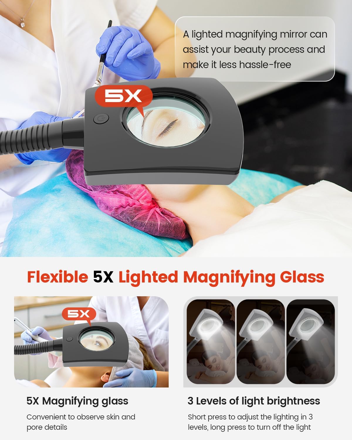 - π¬ 5X Magnification + Pro-Grade LED Illumination. See every detail! Built-in 5X ultra-clear magnifying lens combined with 3-level adjustable LED light provides unparalleled clarity. The 8500K true daylight color temperature minimizes eye strain and reveals genuine skin tone. Easily identify blackheads, blemishes, and imperfections, ensuring targeted, effective treatments for a flawless complexion.