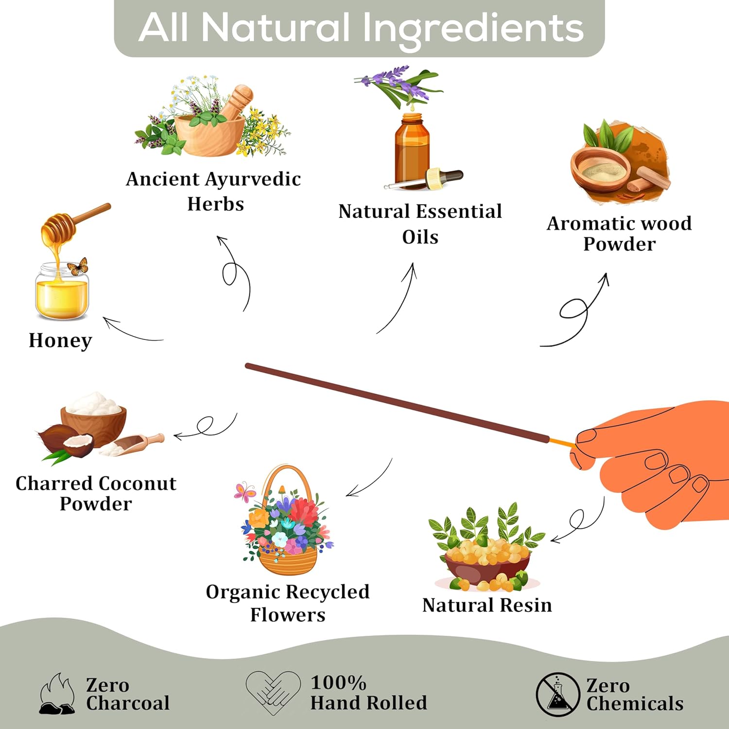 - 100% NATURAL Natural incense Sticks completely handmade MADE FROM SCRATCH by blending natural resins, Herbs, Spices with aromatic wood powders, charred coconut powder fragrant oils and honey.No Dipping in Toxic Chemicals.