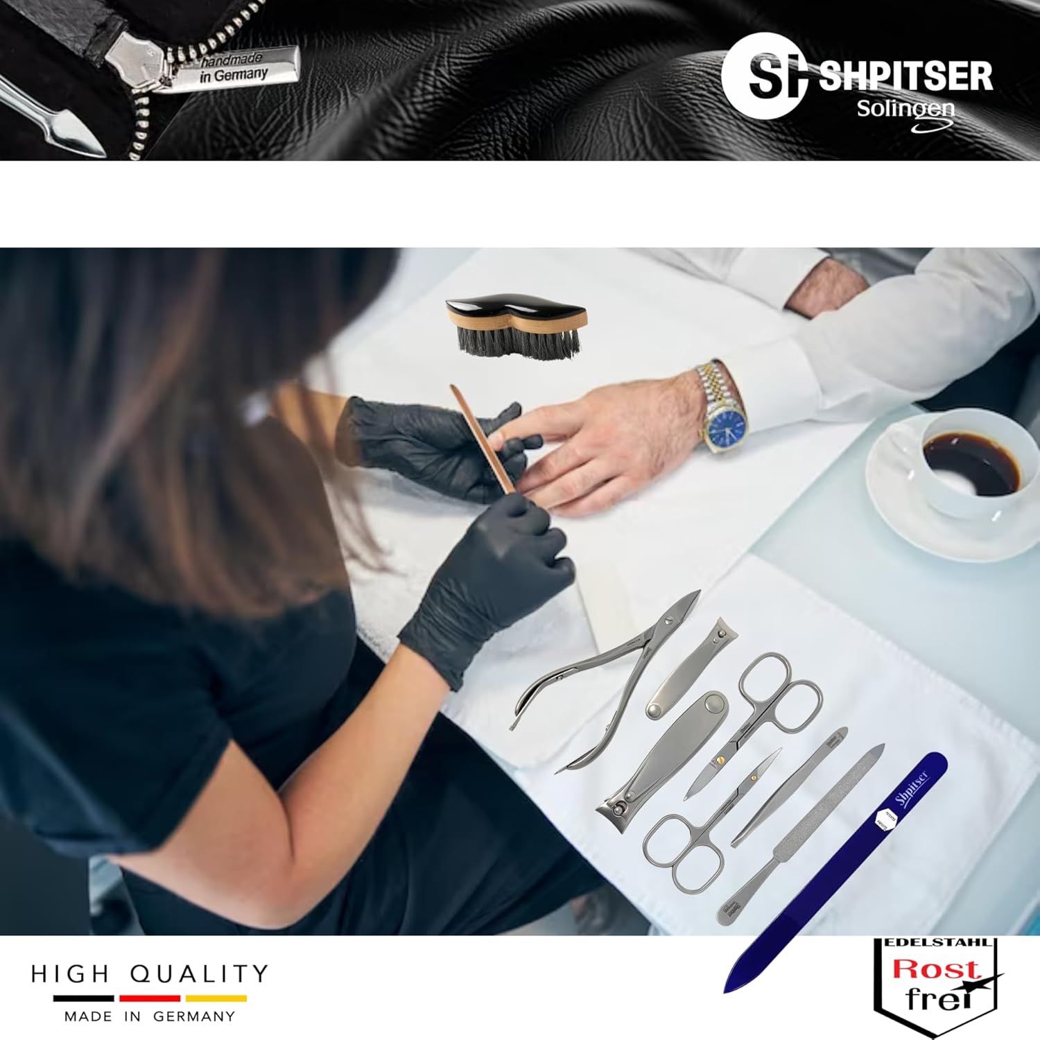 - HANDMADE IN SOLINGEN GERMANY - SHPITSER Professional stainless steel manicure and pedicure tools are expertly crafted and hand-sharpened by skilled artisans. With a commitment to quality and precision, each tool is designed to deliver superior performance and durability.