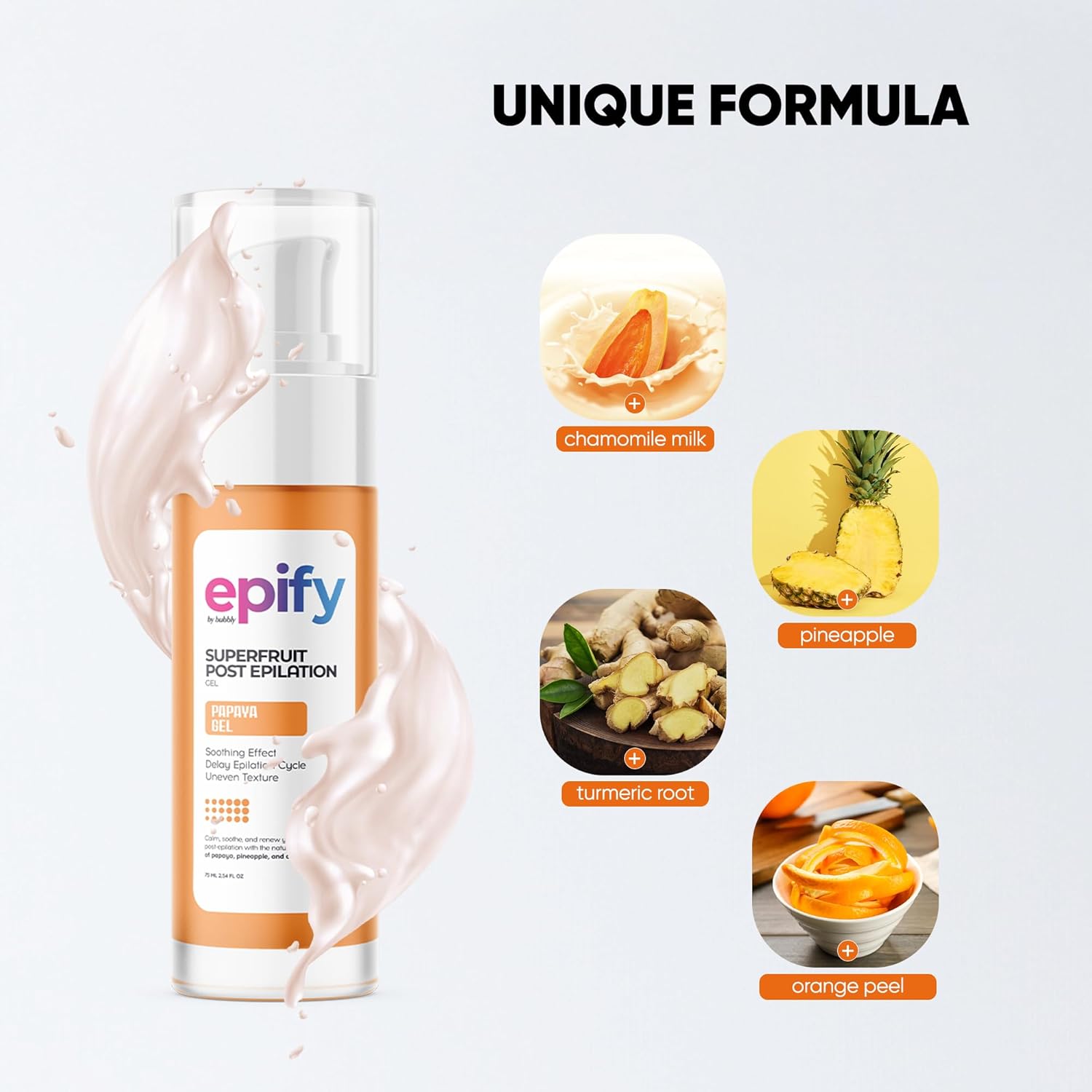 Epify Superfruit Post Epilation Papaya Gel, Hair Inhibitor for Face and Body, Non-Irritating Formula, Soothing Effect, Hair Growth Minimizer, 2.54 Fl Oz (1)