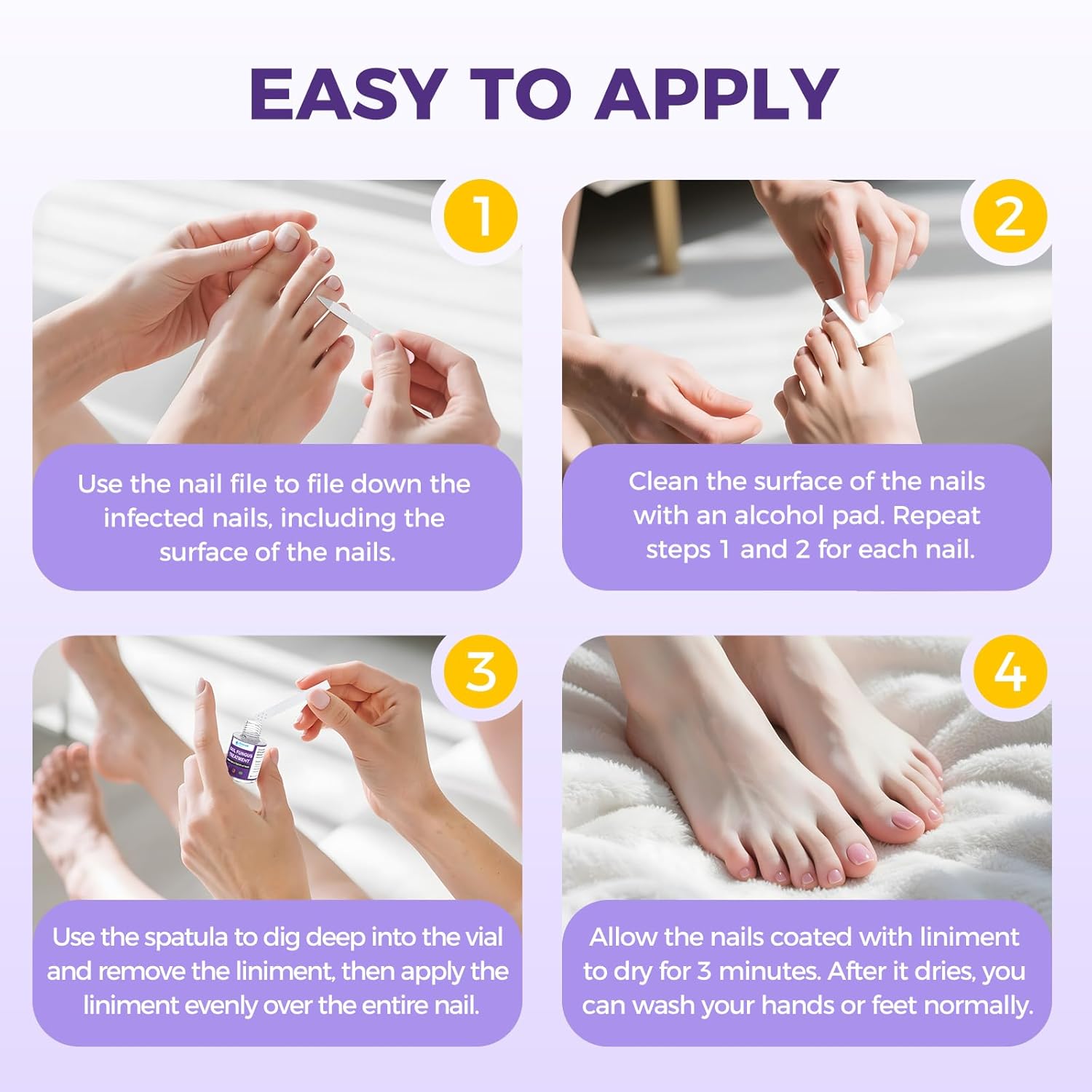 - Easy to Use: Simply file down the nail with a nail file, then apply toenail treatment liniment to the nail. For best results, use 1-2 times a week and see noticeable improvements in just 2-4 weeks