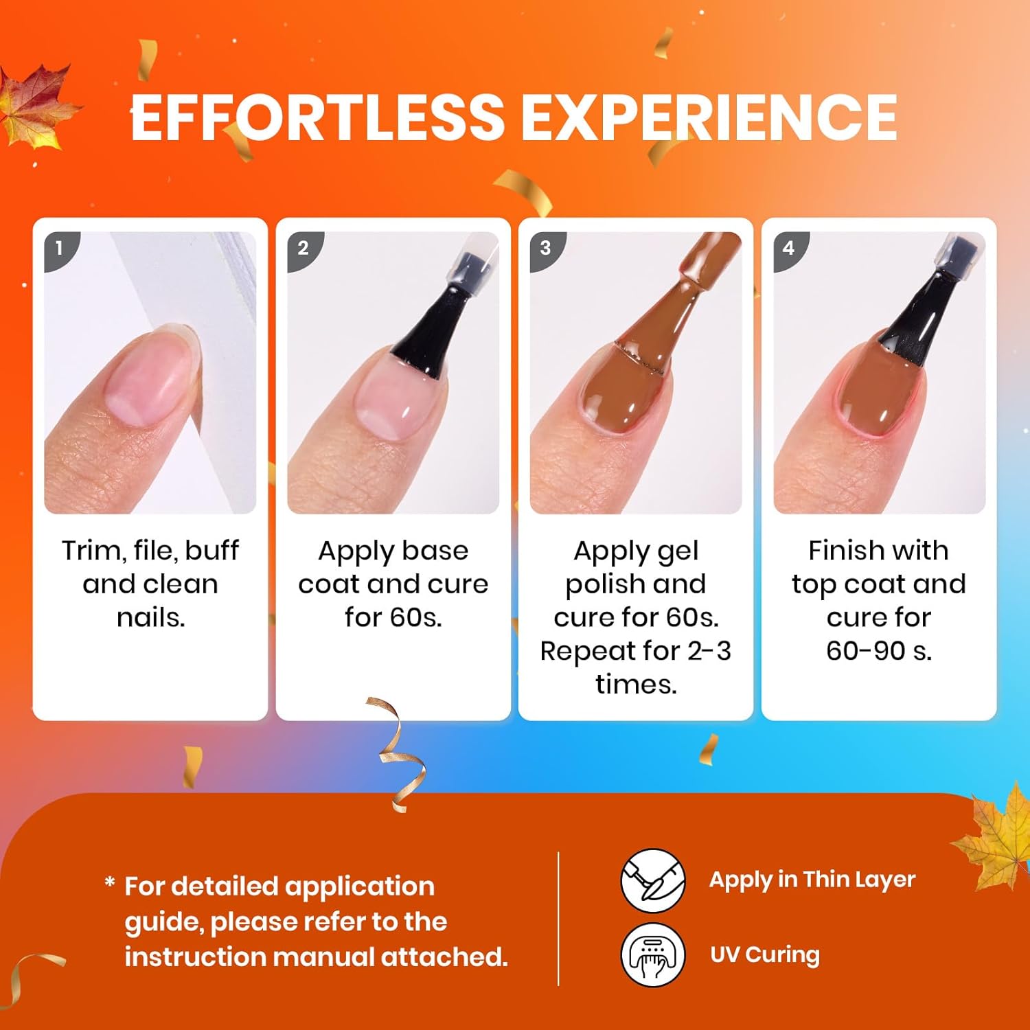- Easy Application & Smooth Coverage β Highly pigmented formula ensures vibrant, even color with every stroke. Beginner-friendly yet delivers professional-quality results.The nail gel polish Beauty Gift Sets need to be cured under LED Dryer Lamp. Average for LED lamps 60-120 secs.
