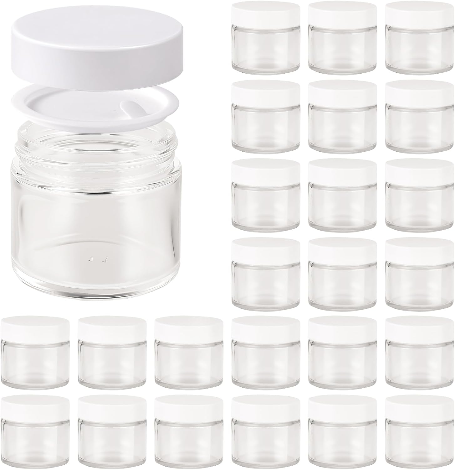 2oz Jars with Lids, Hoa Kinh 24 Pack Clear Glass Jars with Lids Empty Cosmetic Containers Round Airtight Glass Jar with Inner Liners and White Lid for Storing Lotions, Powders, and Ointments