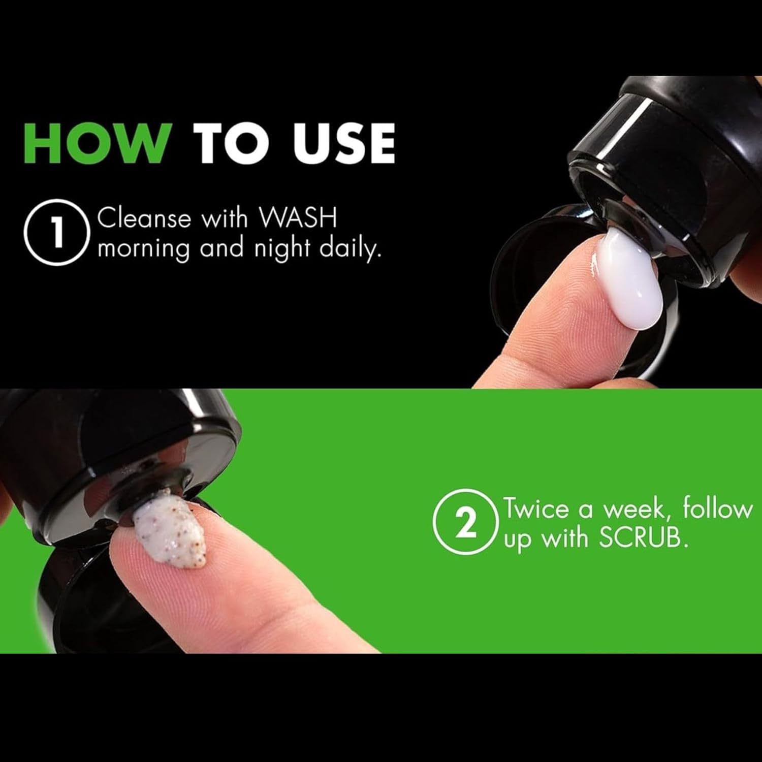 - How to Use: First, rinse your face with some warm water. Squeeze a nickel-size amount of WASH onto your fingers. Briefly rub your hands together to spread it out, then gently apply it all over your face for 10-15 seconds, avoiding your eyes and mouth. After cleansing, rinse off with more water. Use once in the morning and at night. Twice a week, after washing your face, squeeze a nickel-size amount of SCRUB onto your fingers. Gently apply it all over your face, making sure to avoid your eyes and mouth. Spend about 10-15 seconds exfoliating your skin, then rinse off with warm water.