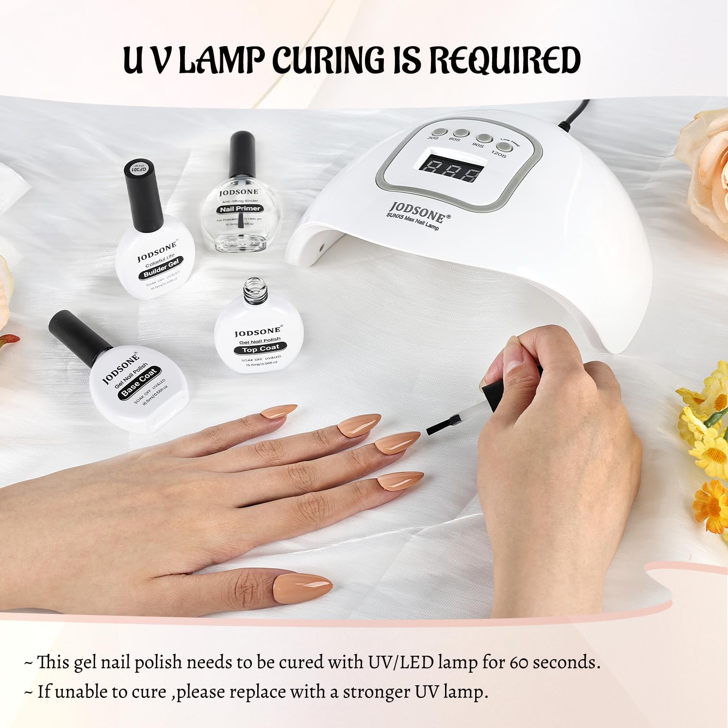 - You Will Receive:JODSONE 4Pcs 16.5ml base coat, top coat, nail primer, and builder gel.The nail primer enhances adhesion, the base coat protects your natural nails, the builder gel strengthens and extends nails, and the top coat delivers a high-gloss, chip-resistant finish.