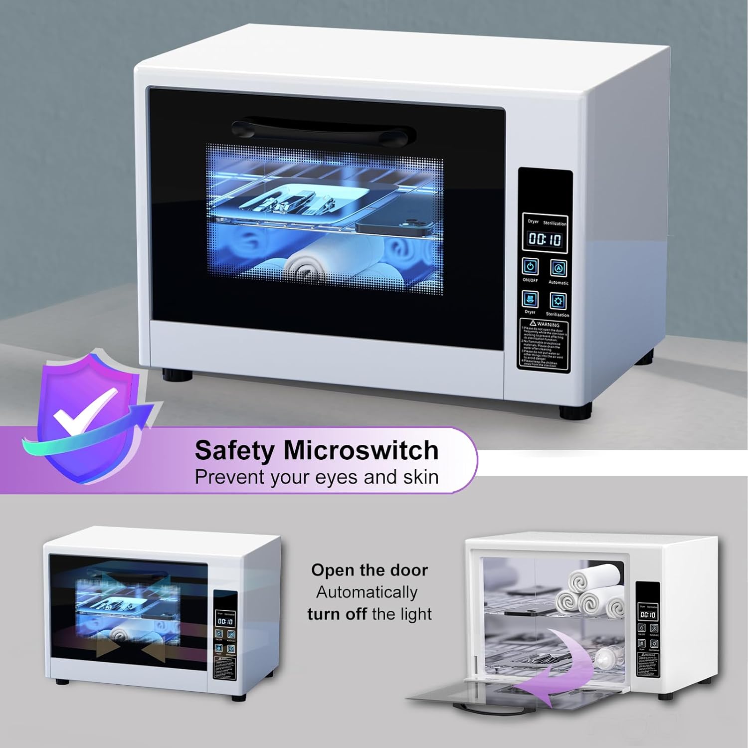 - Safety and Intelligent Cleaning Cabinet: The cleaner cabinet uses cleaning light, not generate heat. Coated glass door can avoid direct exposure to your eyes. Our nail tool cabinet has 3 smart options, all you have to do is select the desired mode and press the button and you're done in 30-60 minutes. Smart security switch sensing, the light will auto-off when the door open.This will protect you from damage