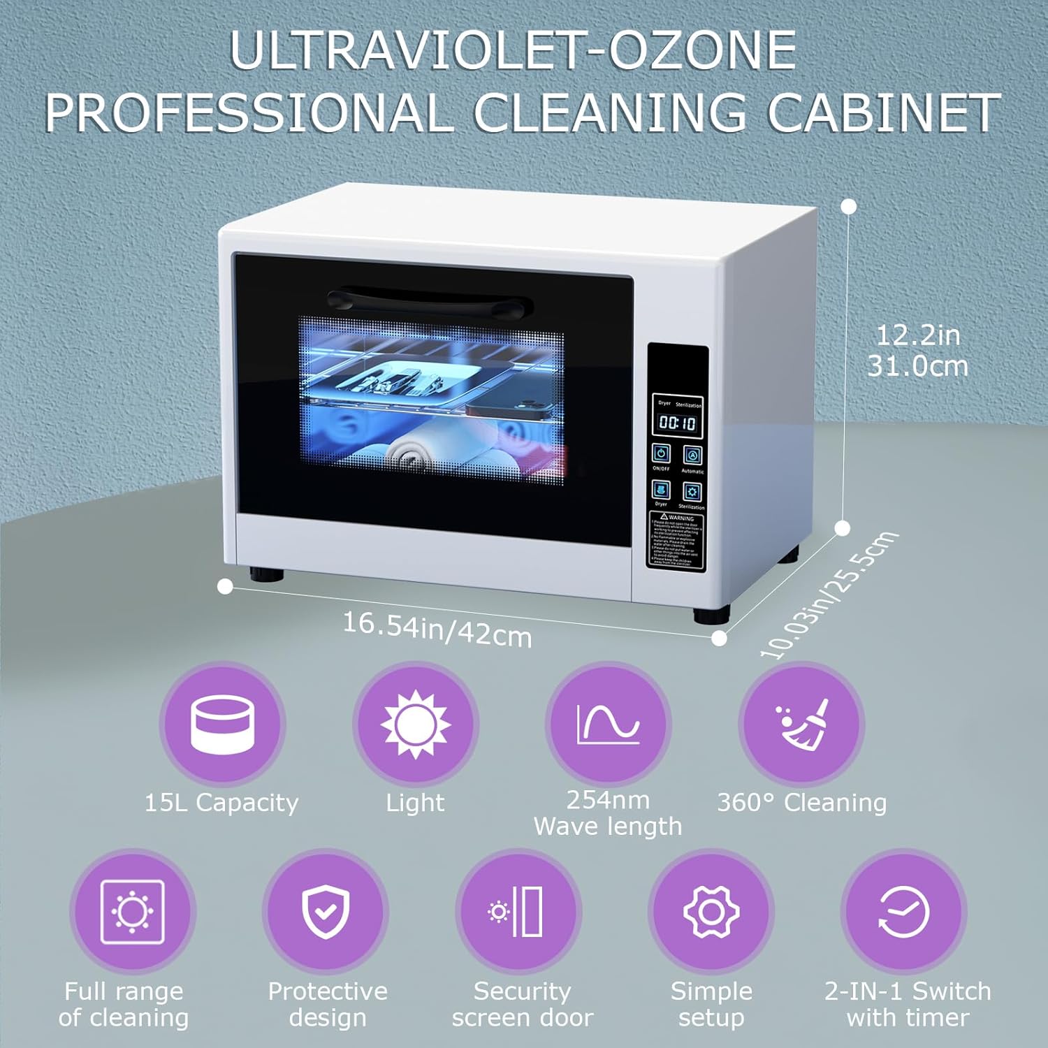 - Powerful & Hot Air Cleaning: This cleaning cabinet uses light and hot air to remove harmful substances and purify the air. light penetrates deep into tools, the stainless steel interior effectively accomplishes 360Β° cleaning of items, while hot air dries them quickly. The result? Clean, dry tools ready for use, providing a reliable hygiene solution for every professional