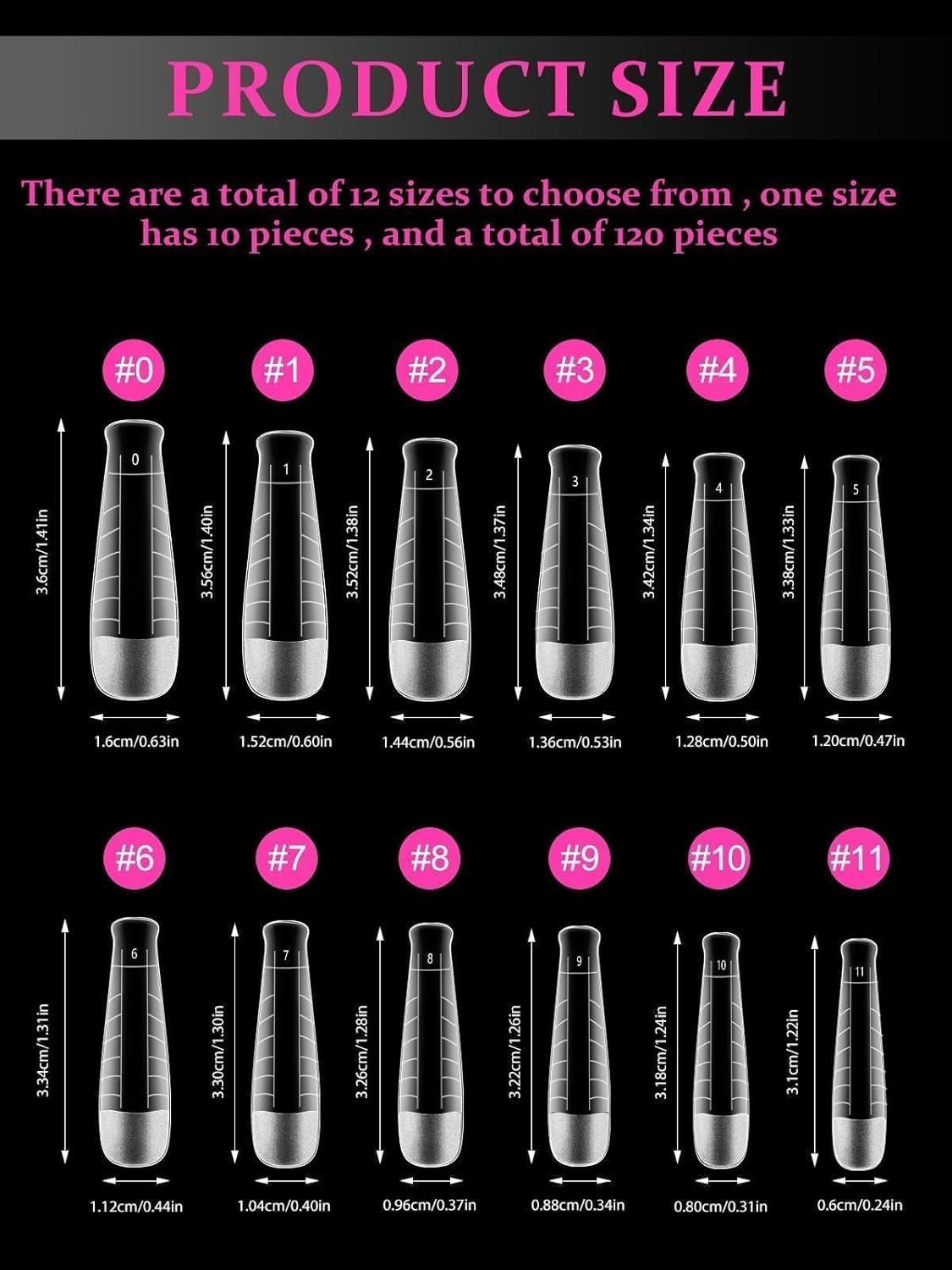 - 【Nail Form Mold with 12 Sizes】120PCS dual forms for poly nail gel offers 12 different nail sizes , and each size of long nail tips is separated by a small grid, a total of 12 grids, so they're easy and convenient to choose the suitable size to meet your nail's need.