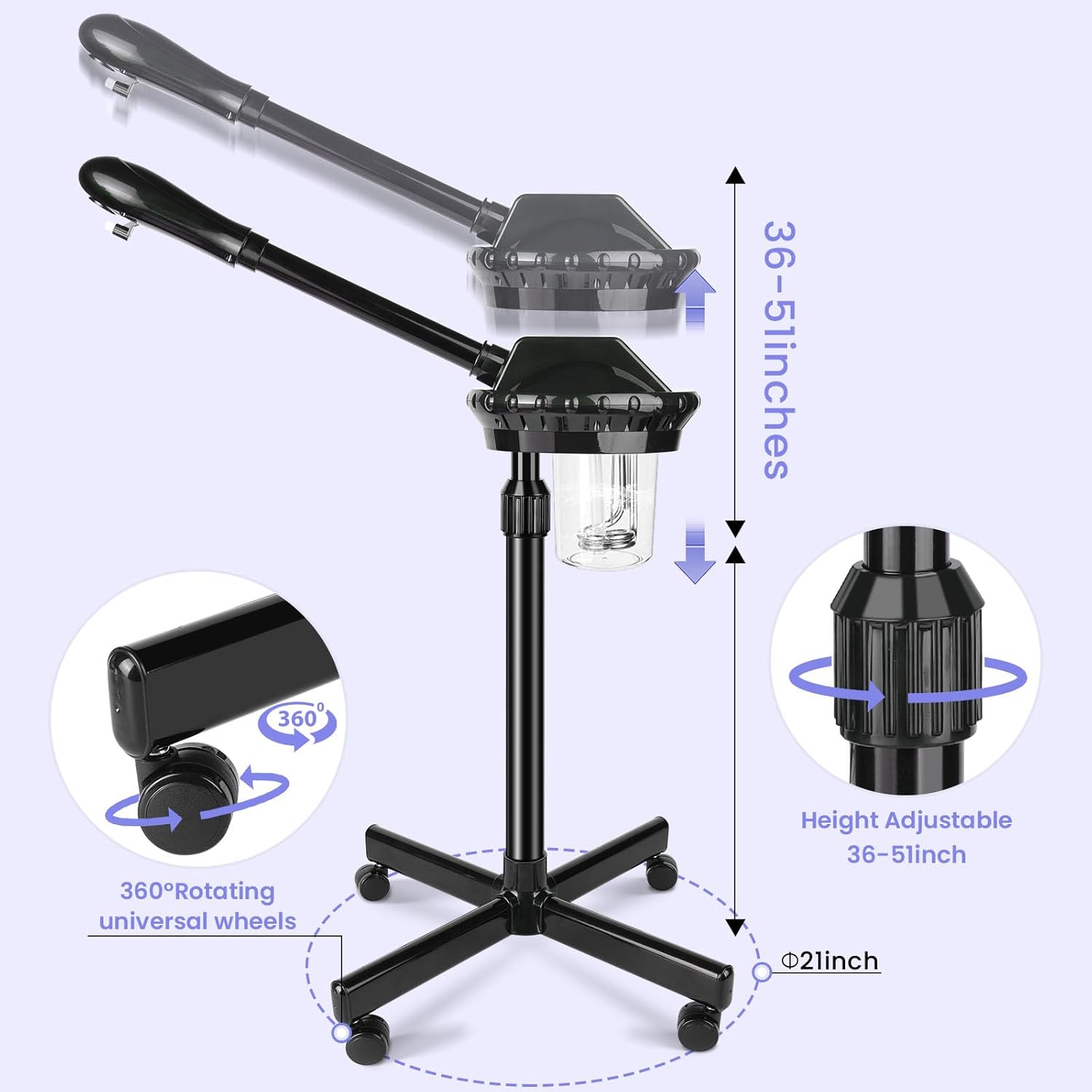 - 【Facial Steamer Adjustable】This facial steamer for face is adjustable from 36 to 52 inches in height, with a 360 degree rotated nozzle and a 360° rotated main body, perfect for different needs of salon and SPA