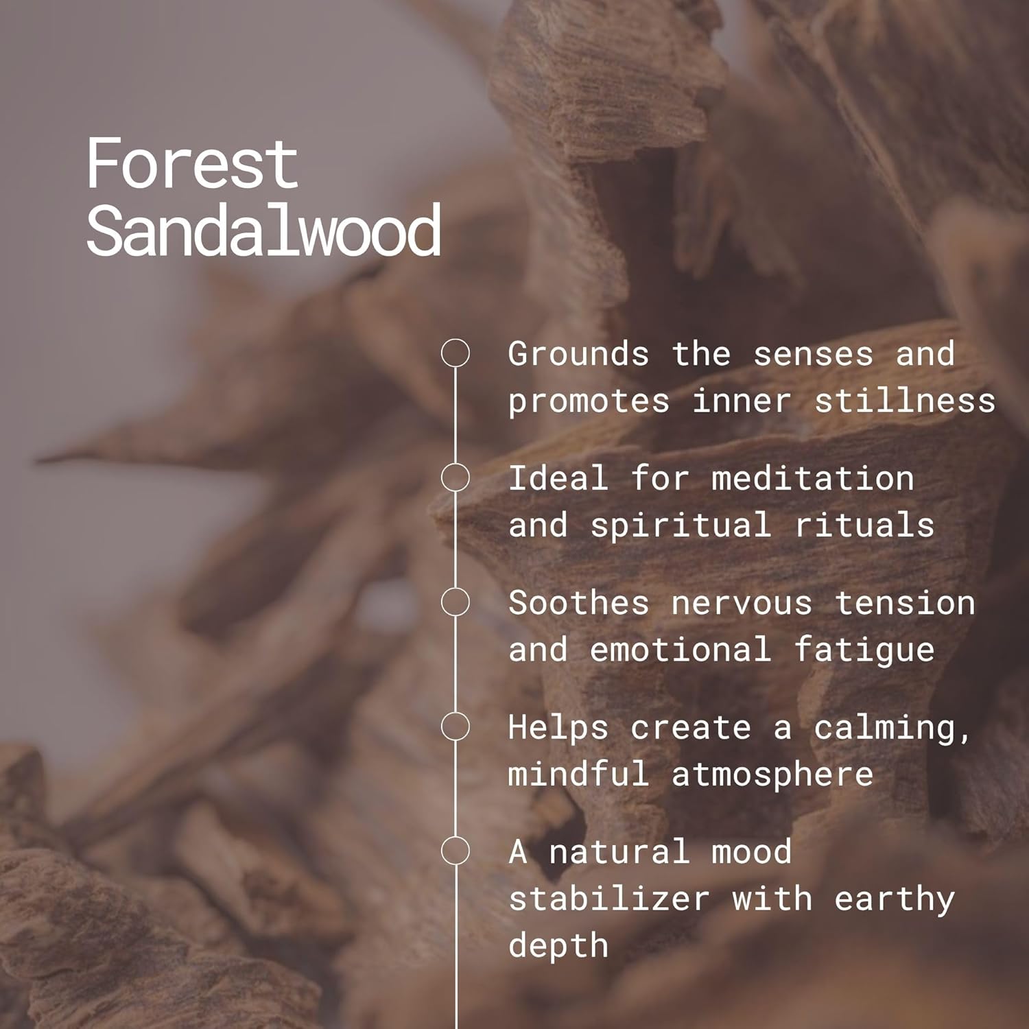 - 🌲 Deep Forest Sandalwood – Calming, Woody, and Grounding Immerse yourself in the serene, earthy aroma of Forest Sandalwood, known for its deeply calming and grounding properties. This rich, woody fragrance evokes the tranquility of ancient forests and supports mental clarity, emotional balance, and spiritual focus. Ideal for meditation, yoga, or creating a peaceful home sanctuary.