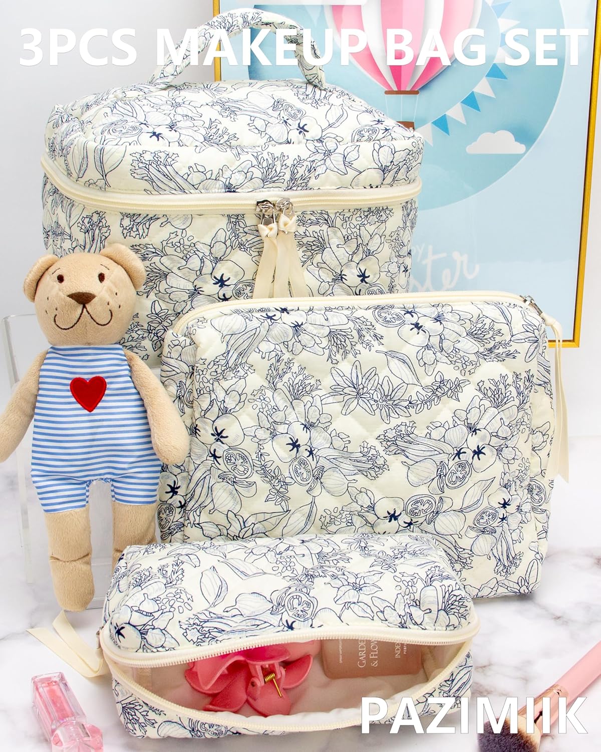 PAZIMIIK 3PCS Makeup Bag SET Large Travel Quilted Zipper Soft Cosmetic Case Pouch for Women Girls Make Up,Flower White