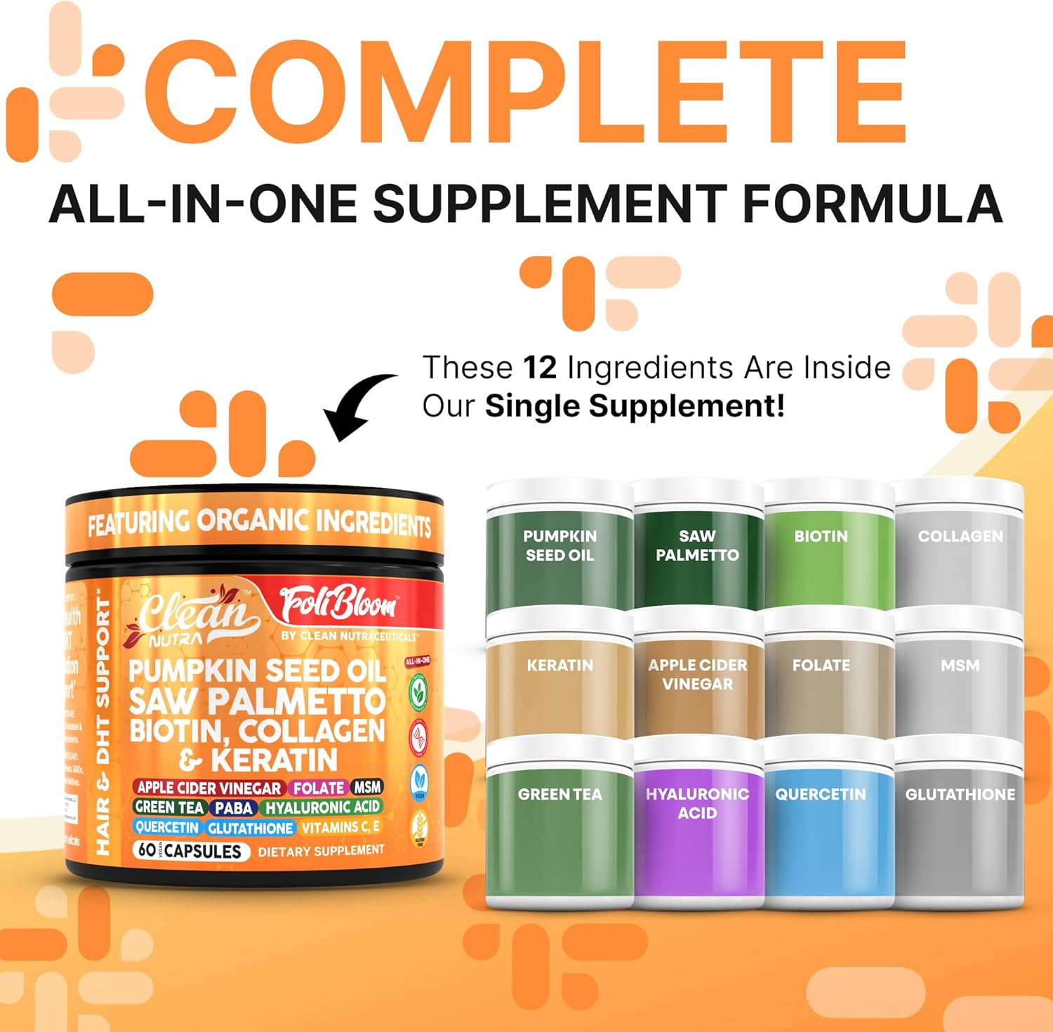 Clean Nutra Pumpkin Seed Oil Saw Palmetto Biotin Collagen Keratin MSM Folate Hyaluronic Acid Supplements B12 Zinc Hair Supplement for Women Men Iodine 5-MTHF B-12 Vitamin B9-60 Vegan Capsules Count
