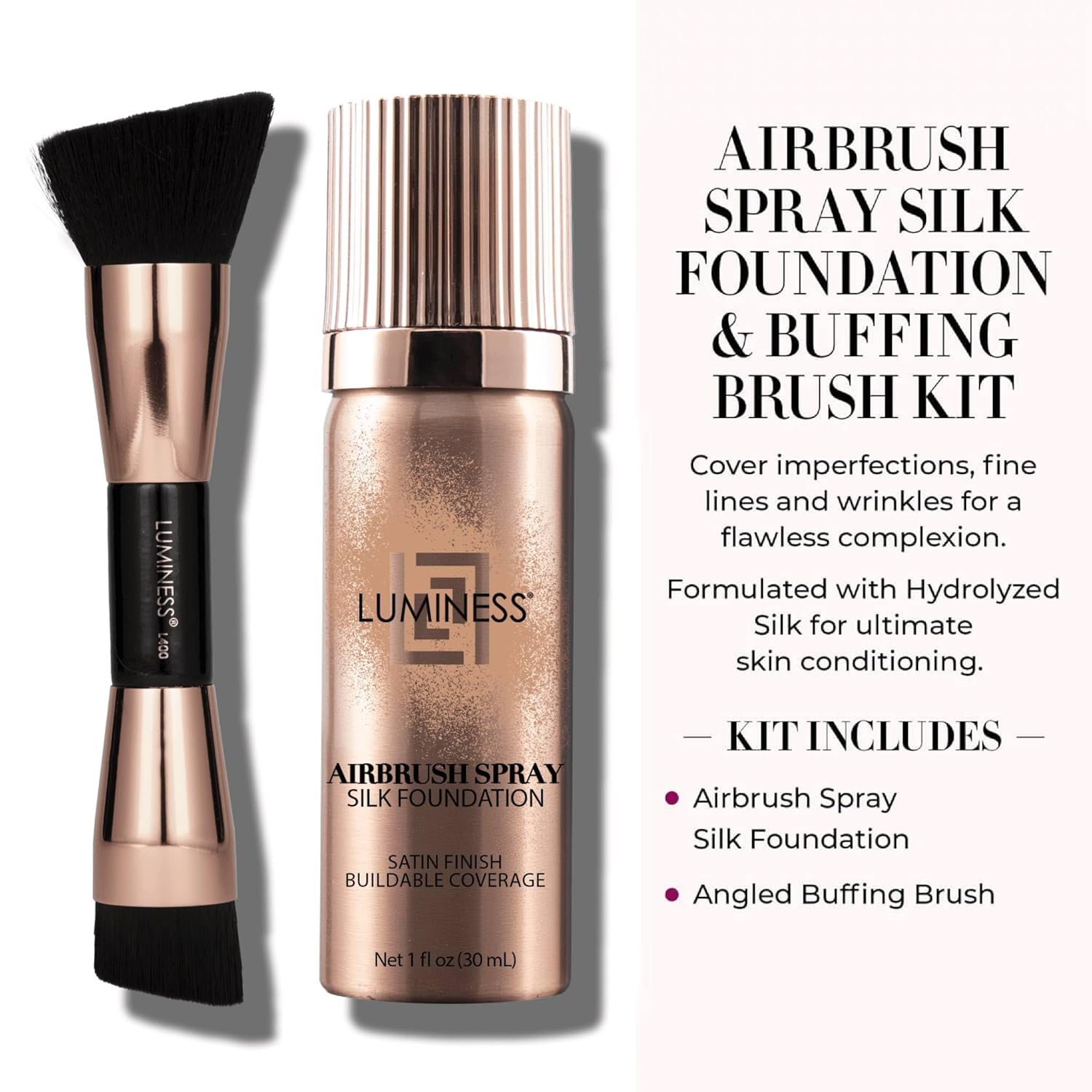 LUMINESS Silk Airbrush Spray Foundation 2-PC Kit - Foundation & Dual-Sided Angled Makeup Brush - Buildable Coverage, Anti-Aging Formula, Humidity Resistant, Hydrates & Moisturizes, Light Medium