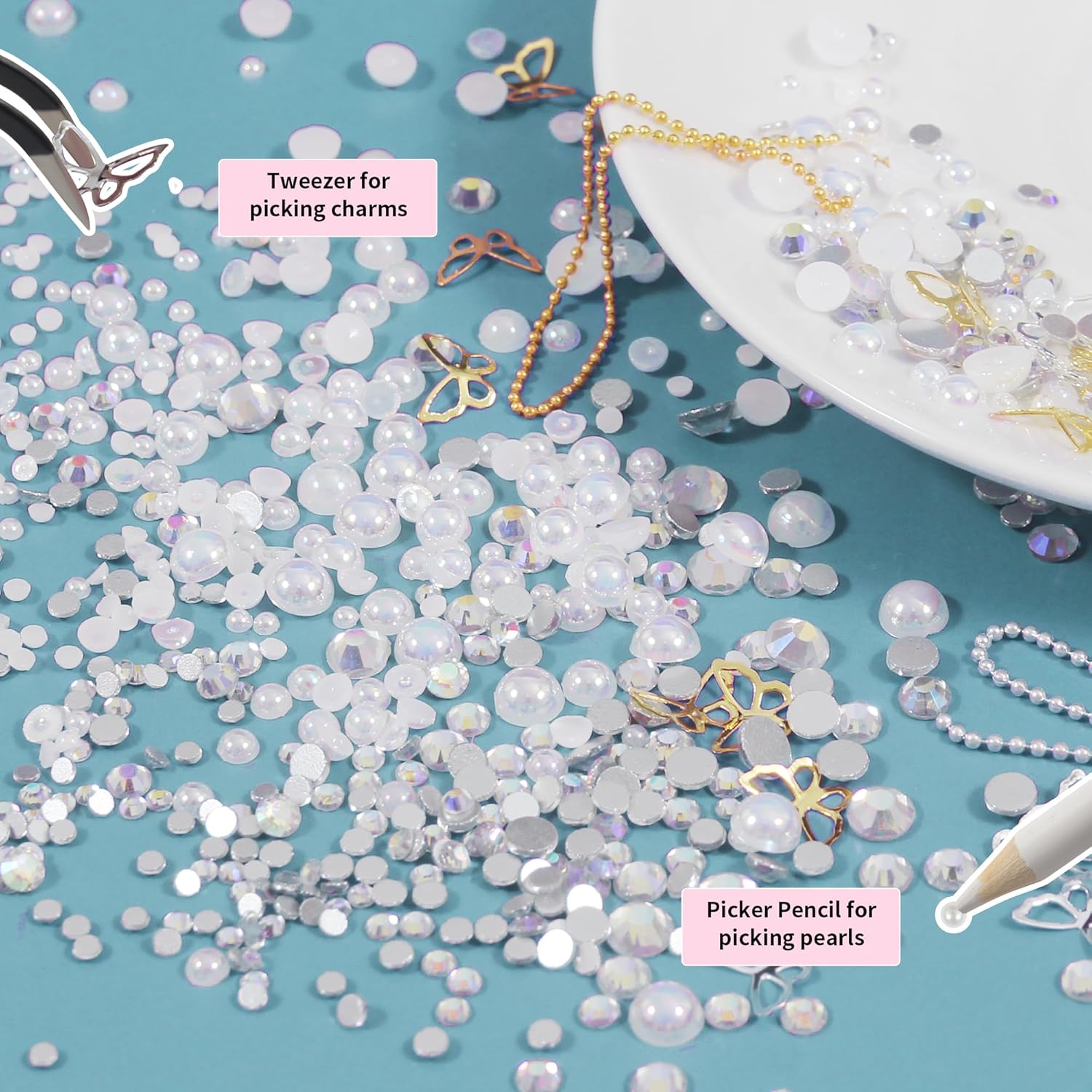 - Design:The nail charms are divided into 2 boxes. Butterflies, flowers, bears, bunnies, hearts and other charms mixed into in a box of 12 grids.rhinestones, pearls and other charms in another box of different grids