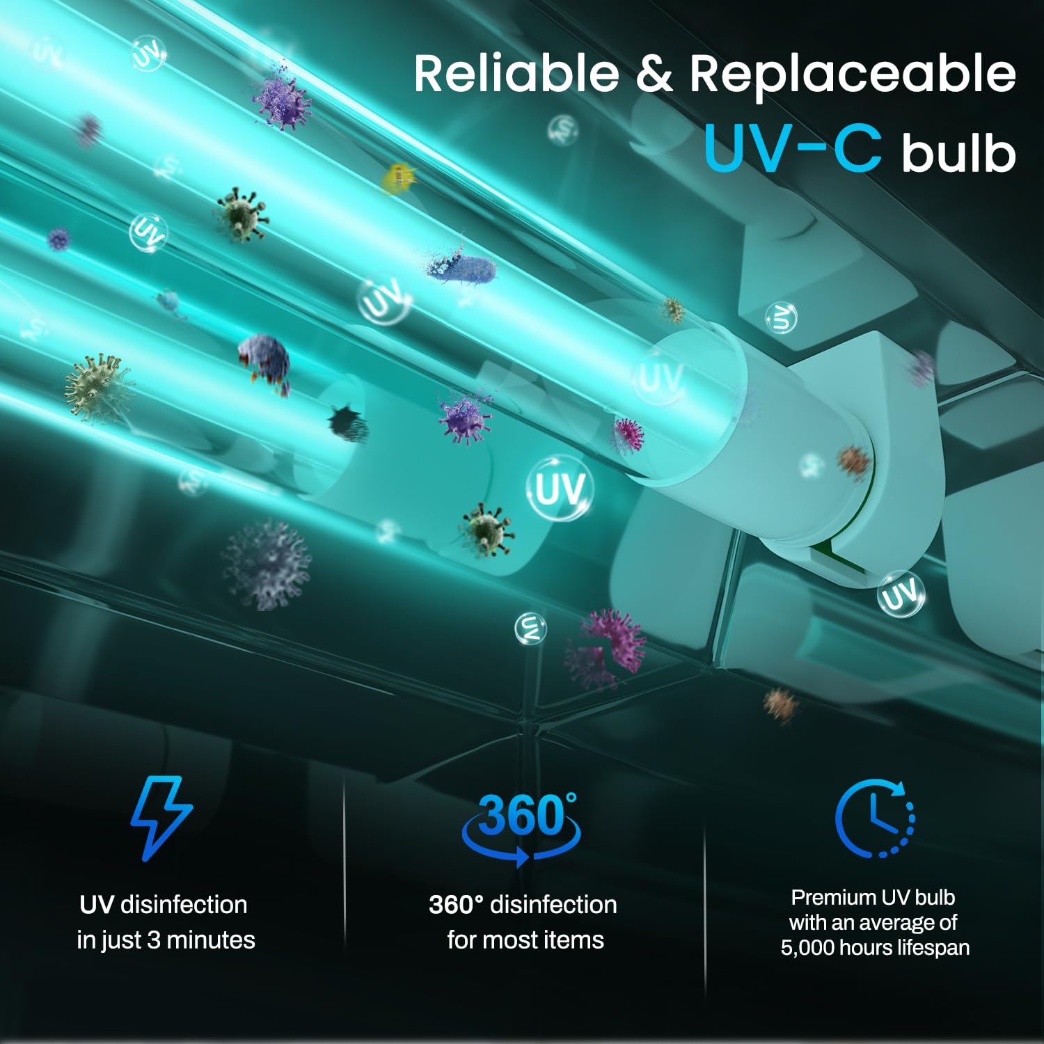 - 360Β° Disinfection: Featured a durable and replaceable UV bulb, the sanitizer cabinet disinfects most items efficiently and thoroughly in just 3 minutes