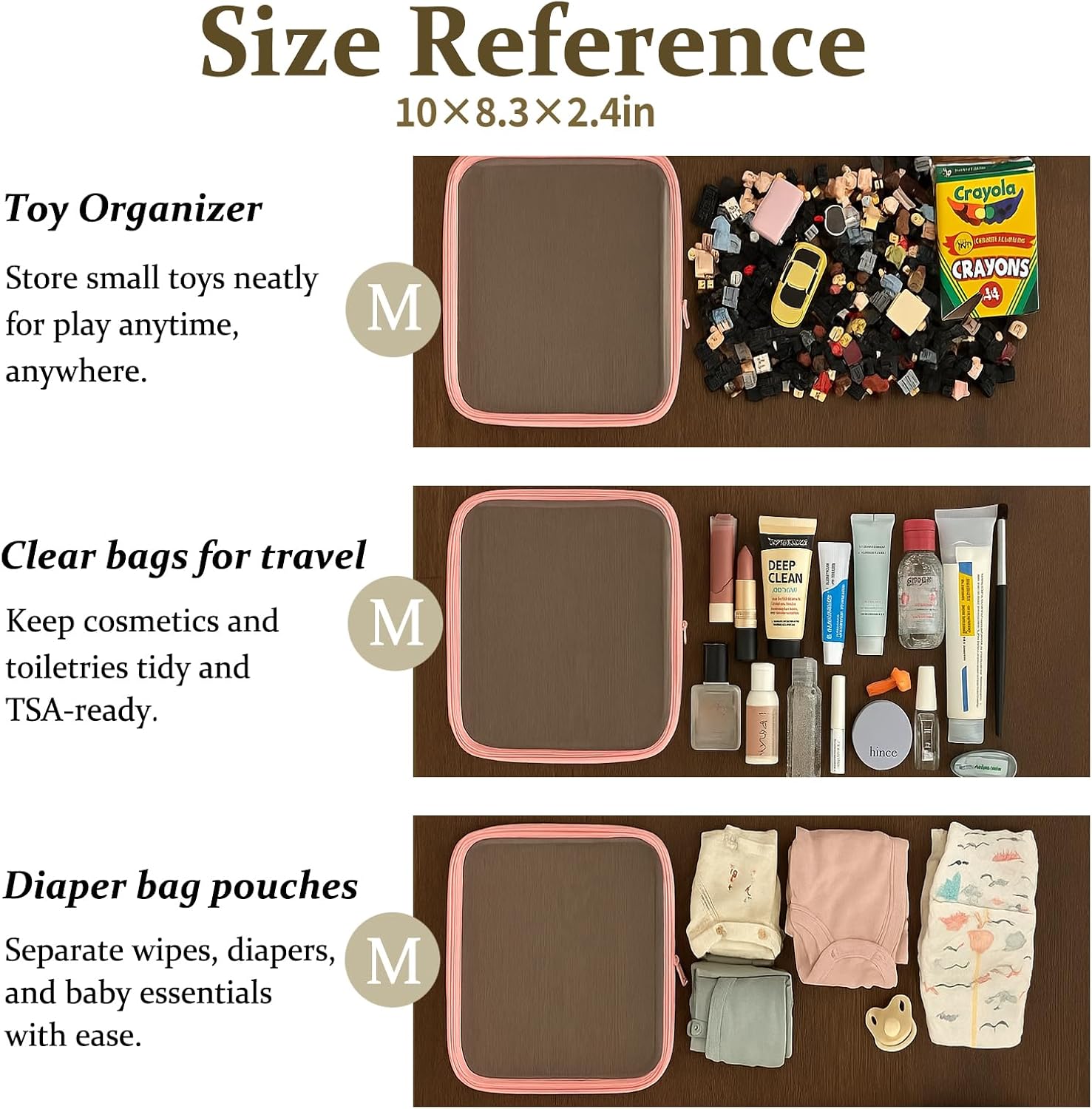 - Multi-Use Storage for Daily Essentials. Perfect as a bag organizer for makeup, toiletries, charging cables, pens, or travel-size items. Whether at home or packing a diaper bag, these clear zipper pouches help sort small items with ease.
