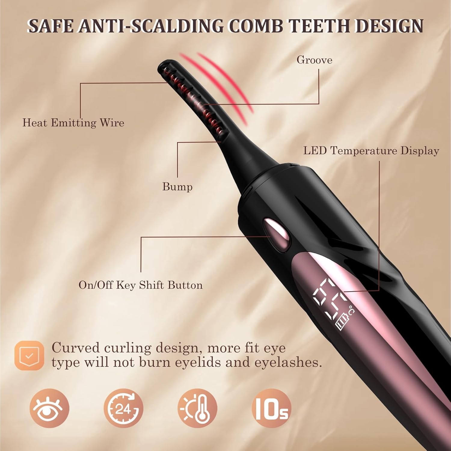 - 【Careful Design and Safety Protection】This electric eyelash curler is easy to operate. The 15°arc brush head fits your lashes better, temperature memeory function, can directly display the temperature set in the last use. The lash curler with 5 minutes no-operation auto-break, anti-misoperation, heat insulation protection comb.he thermal insulating protection slots can avoid heat contacting the eyelid.