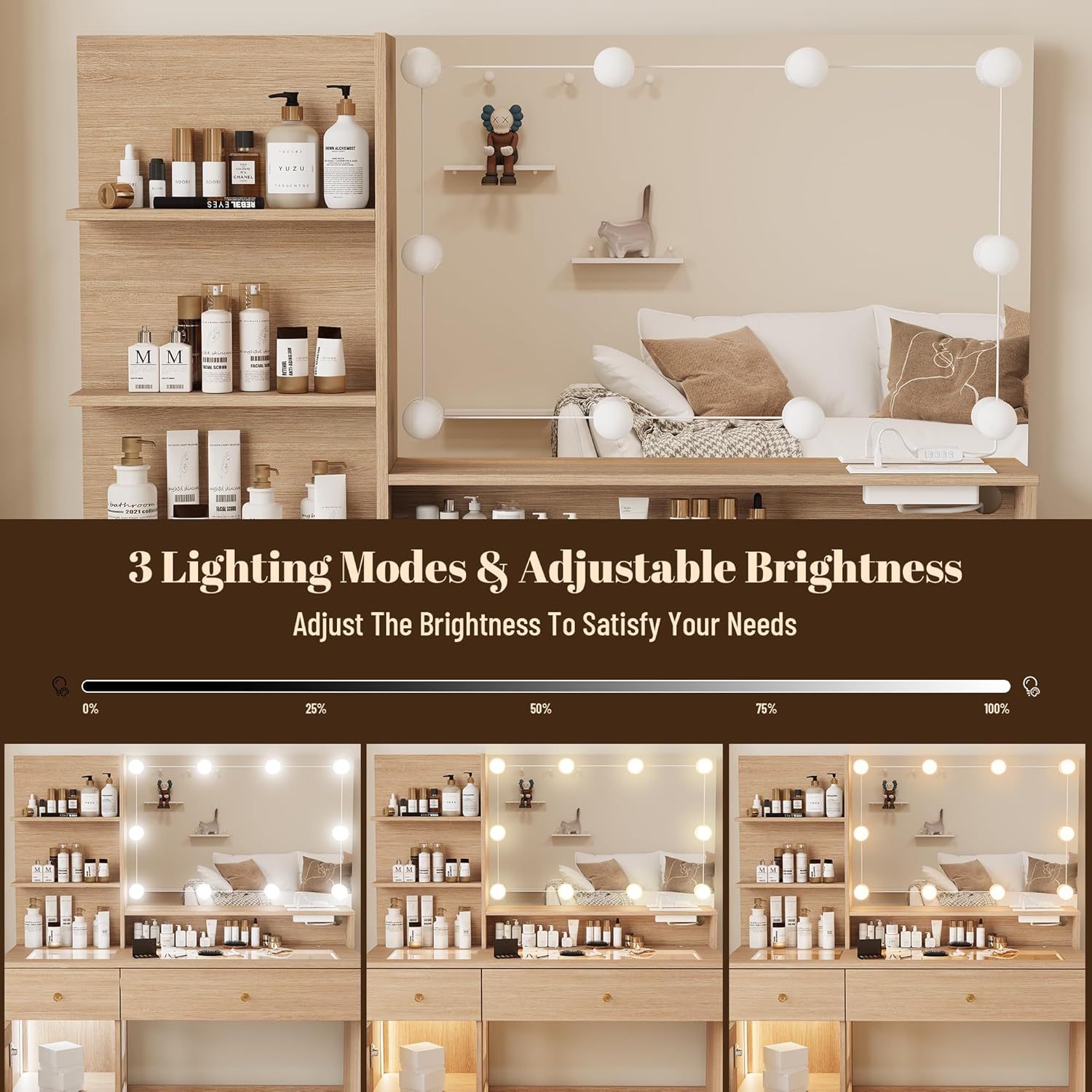 40" Vanity Desk with Large Mirror and Lights, Modern Glass Top Makeup Vanity Set with Power Outlet, Drawers and Cabinet, 3 Lighting Color Adjustable Dressing Table for Bedroom,Oak